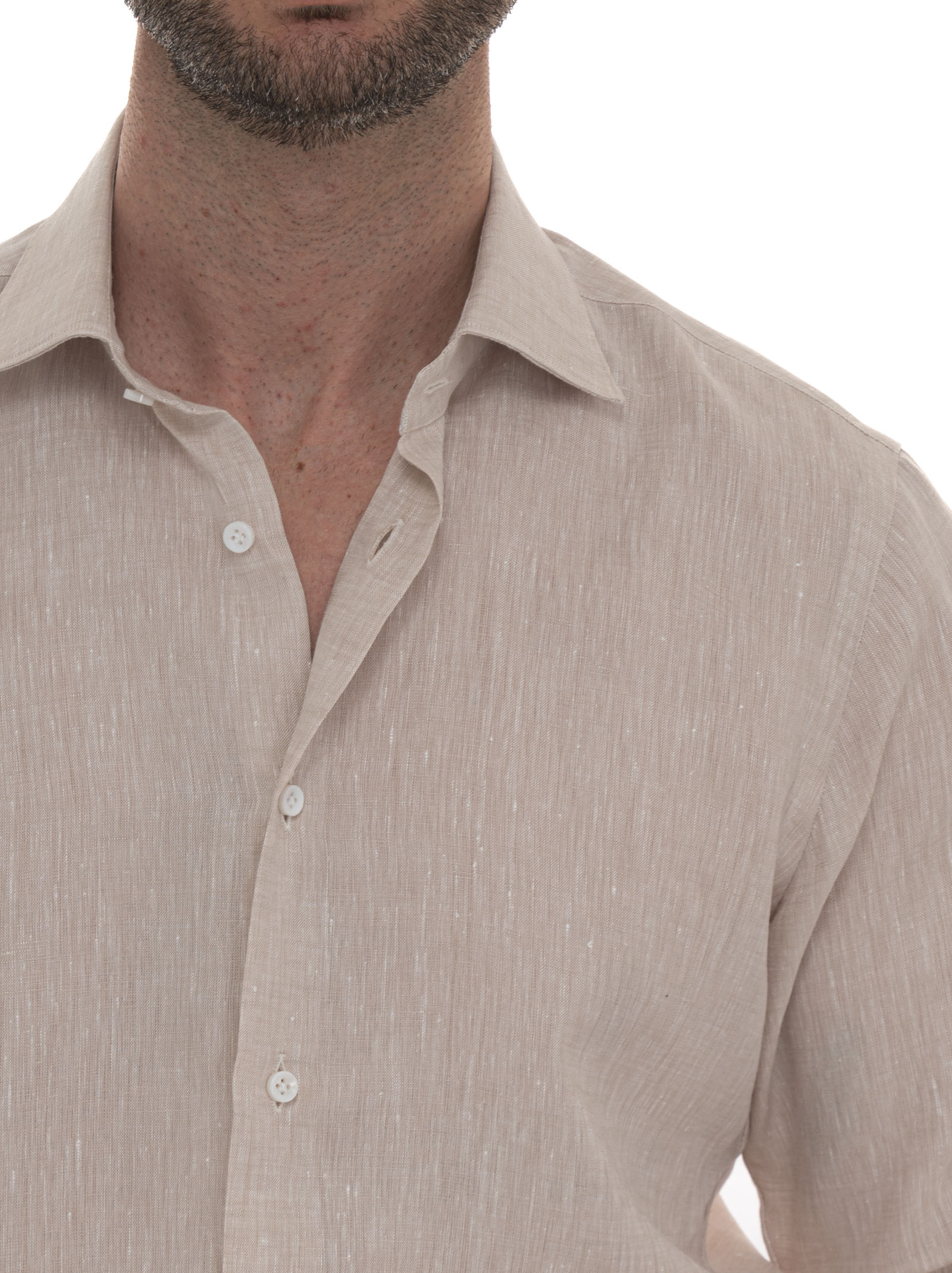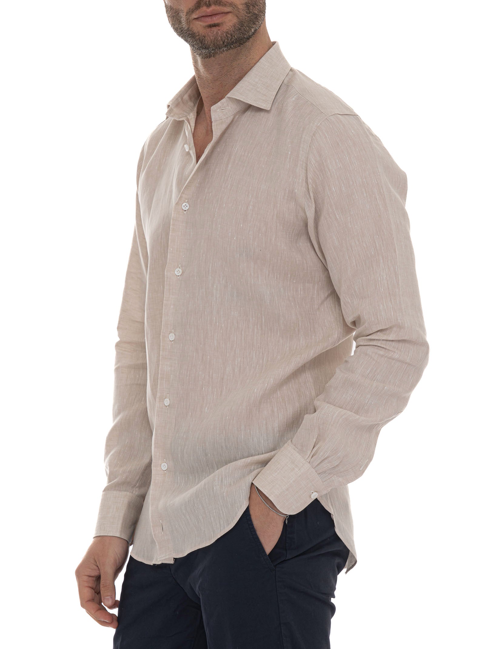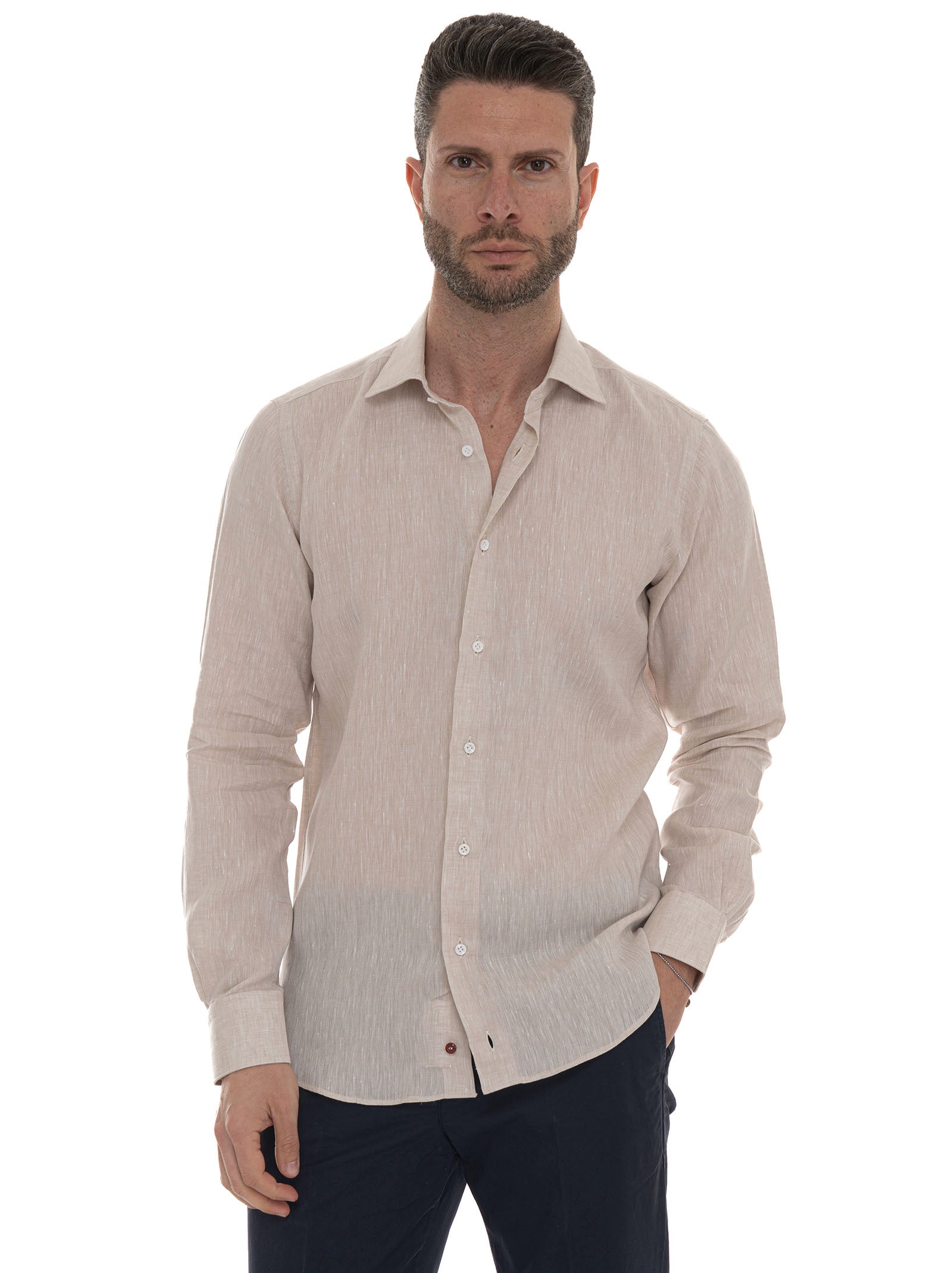 Camicia classica da uomo, collo classico italiano, tessuto di lino, pochette in abbinato, schiena con due pinces, composizione: 100% lino, linea: CARREL.