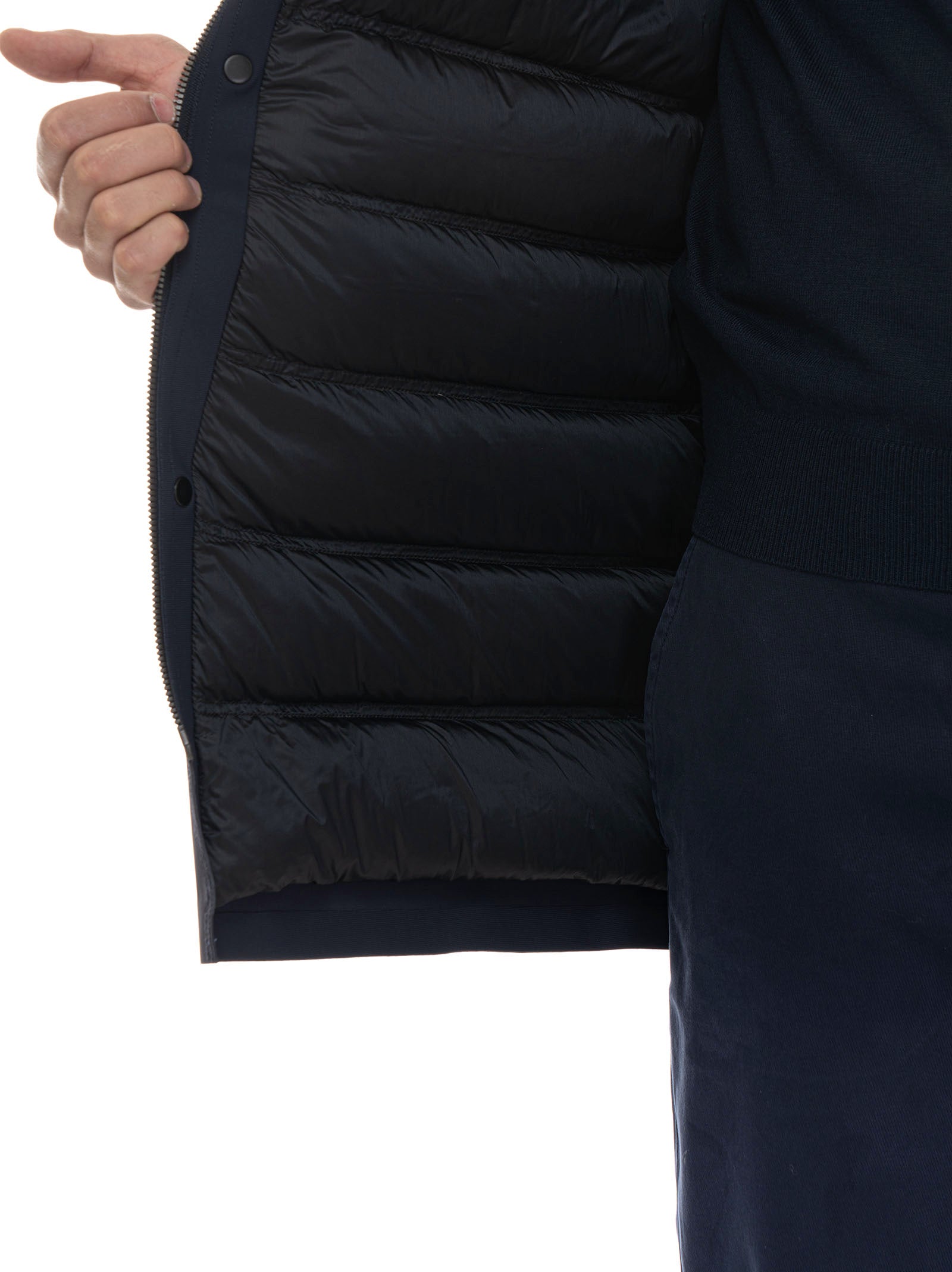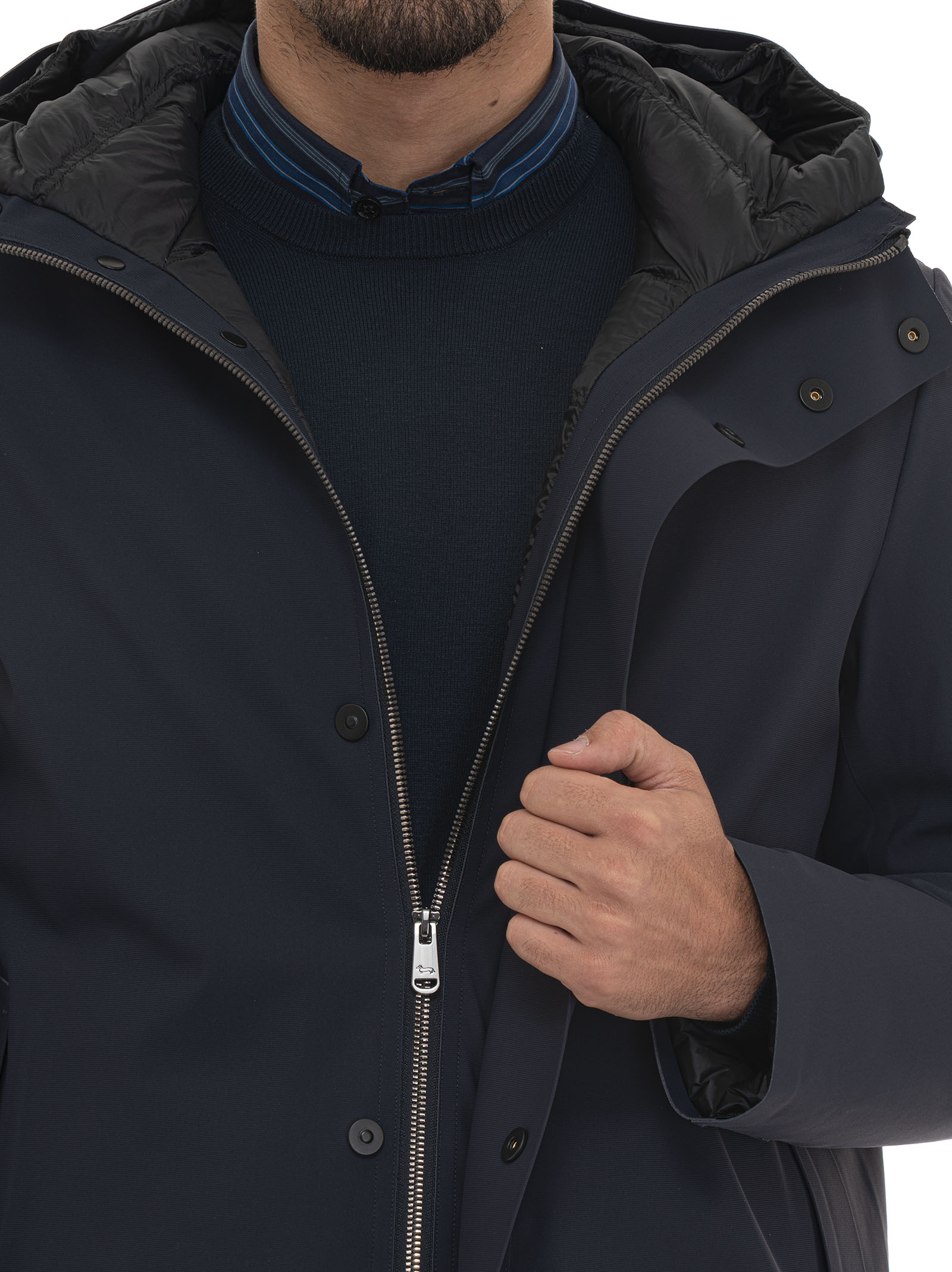 Giaccone con cappuccio, chiusura con bottone e zip a scomparsa, polsino antivento, logo sul braccio, tasche interne multifunzione, composizione: 74% poliammide, 26% elastan, interno: 90% piumino, 10% piuma, linea: HARMONT & BLAINE.