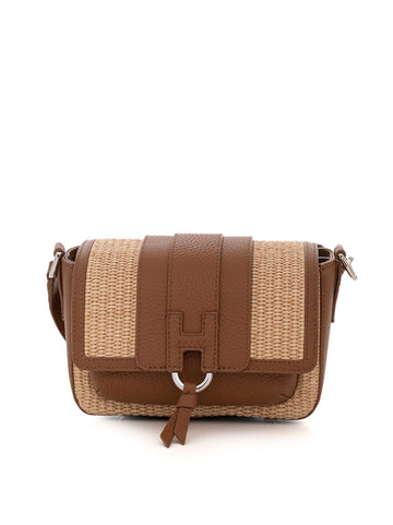 Borsa piccola in pelle, pelle martellata, dettagli in rafia, tracolla removibile, chiusura con bottone automatico...