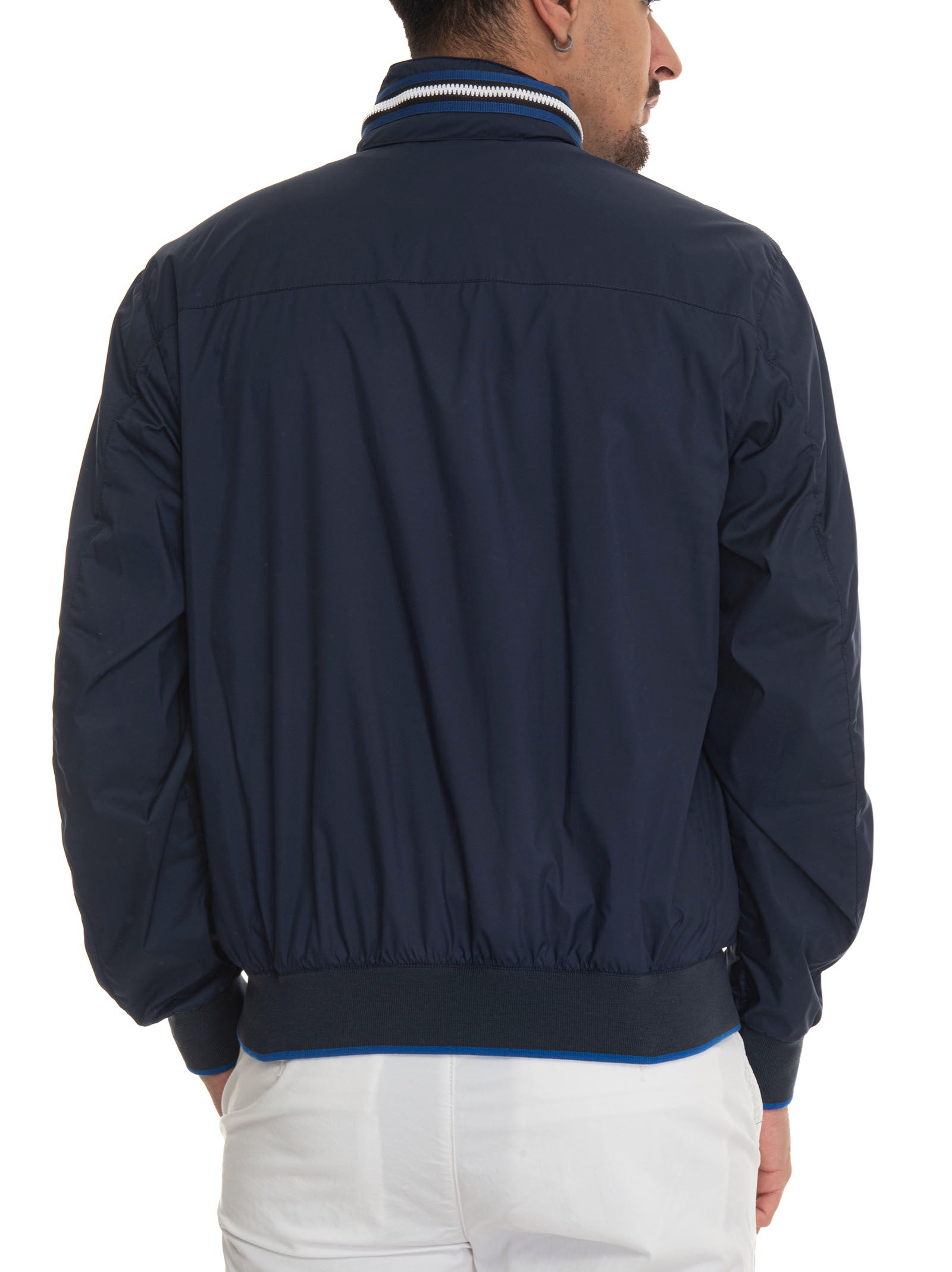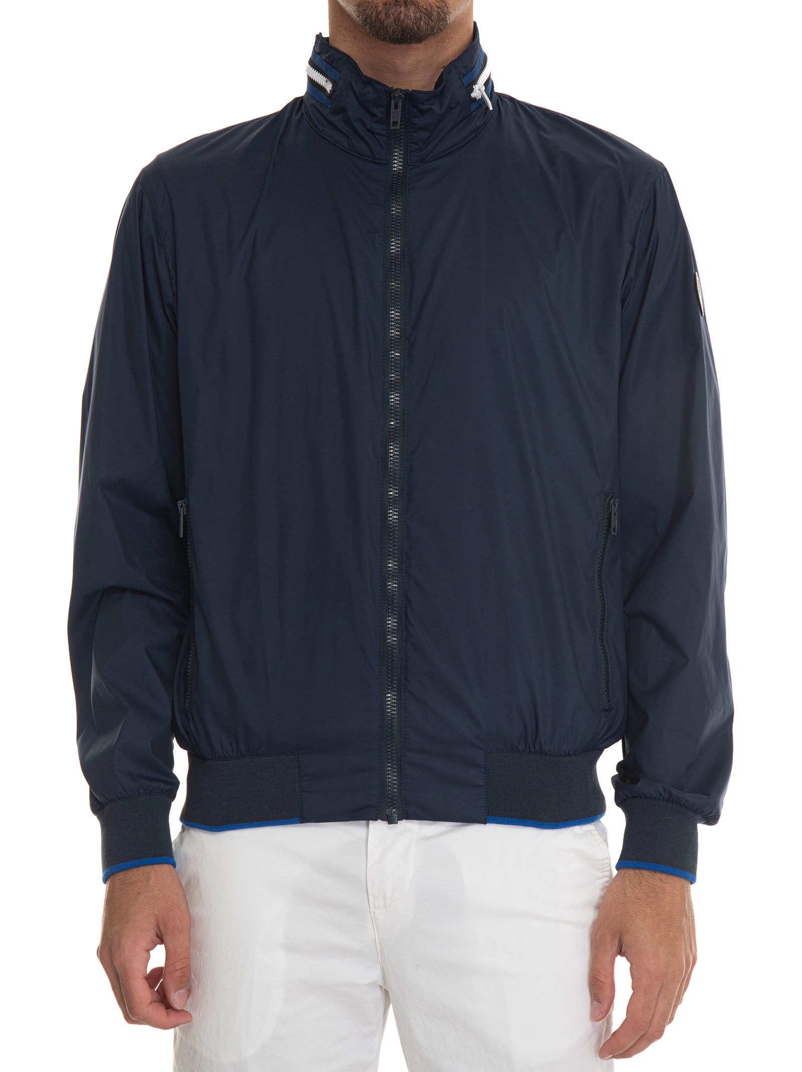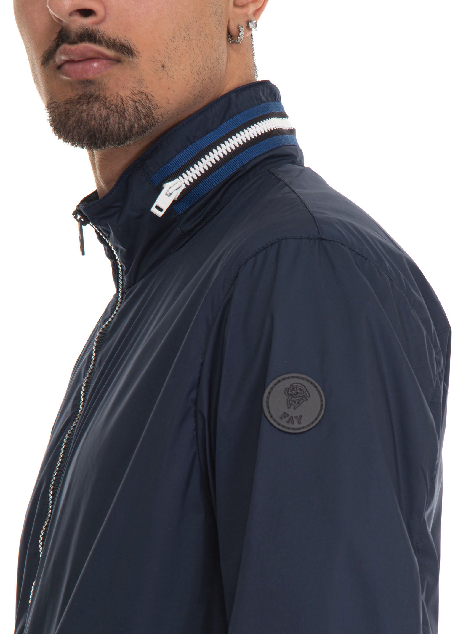 Giubbino in nylon, polsini e vita in maglia elasticizzata, chiusura zip, cappuccio a scomparsa, logo sul braccio, profili in contrasto, tasche con chiusura zip, composizione: 100% poliestere, linea: FAY.