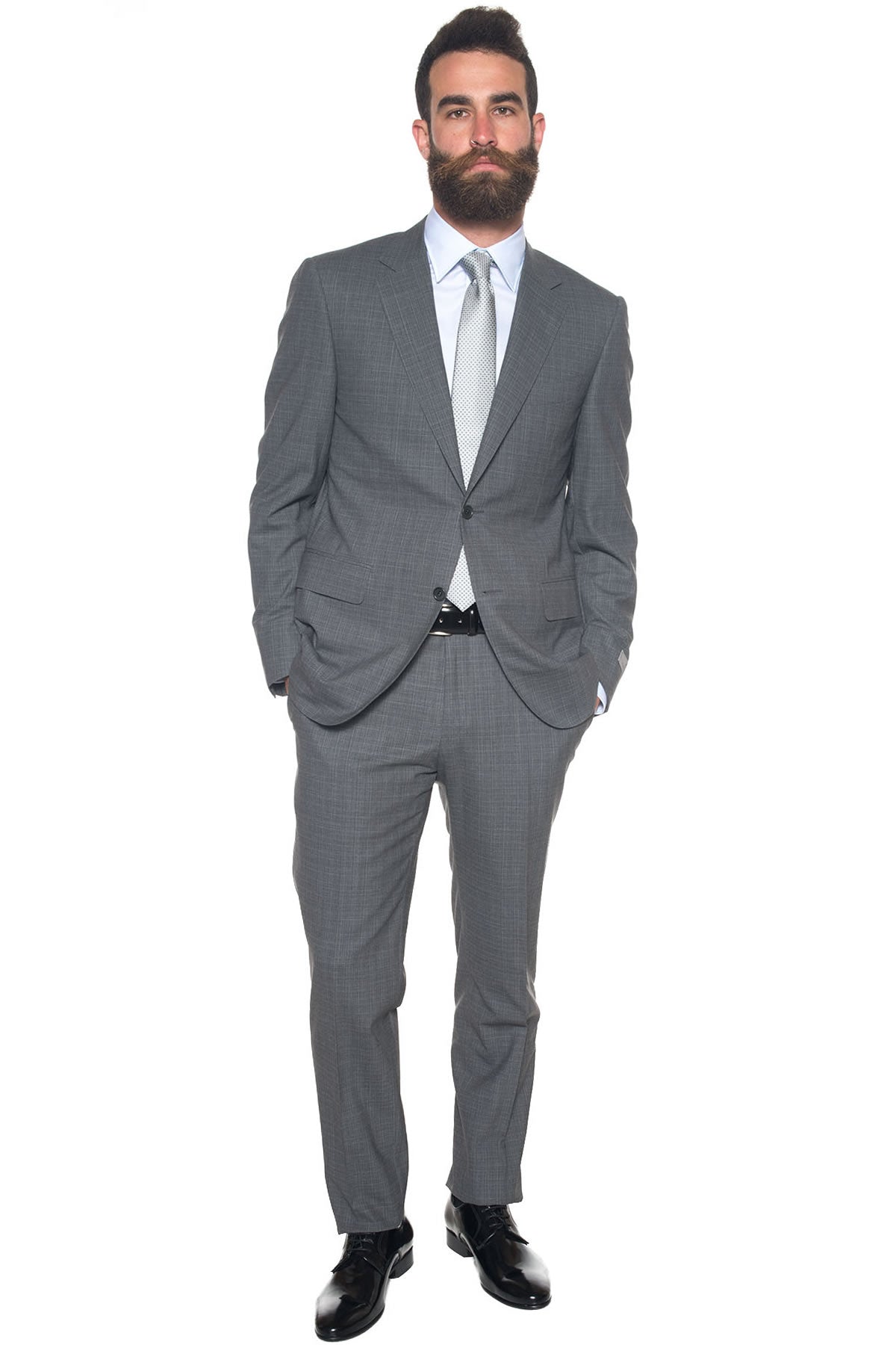 Abito da uomo 2 bottoni, fantasia tinta su tinta, lunghezza giacca 75cm (per tg.50), pantalone piatto, fondo 19 cm, made in italy, vestibilità regular, composizione: 100% lana, interno: 100% cupro, linea: CANALI.
