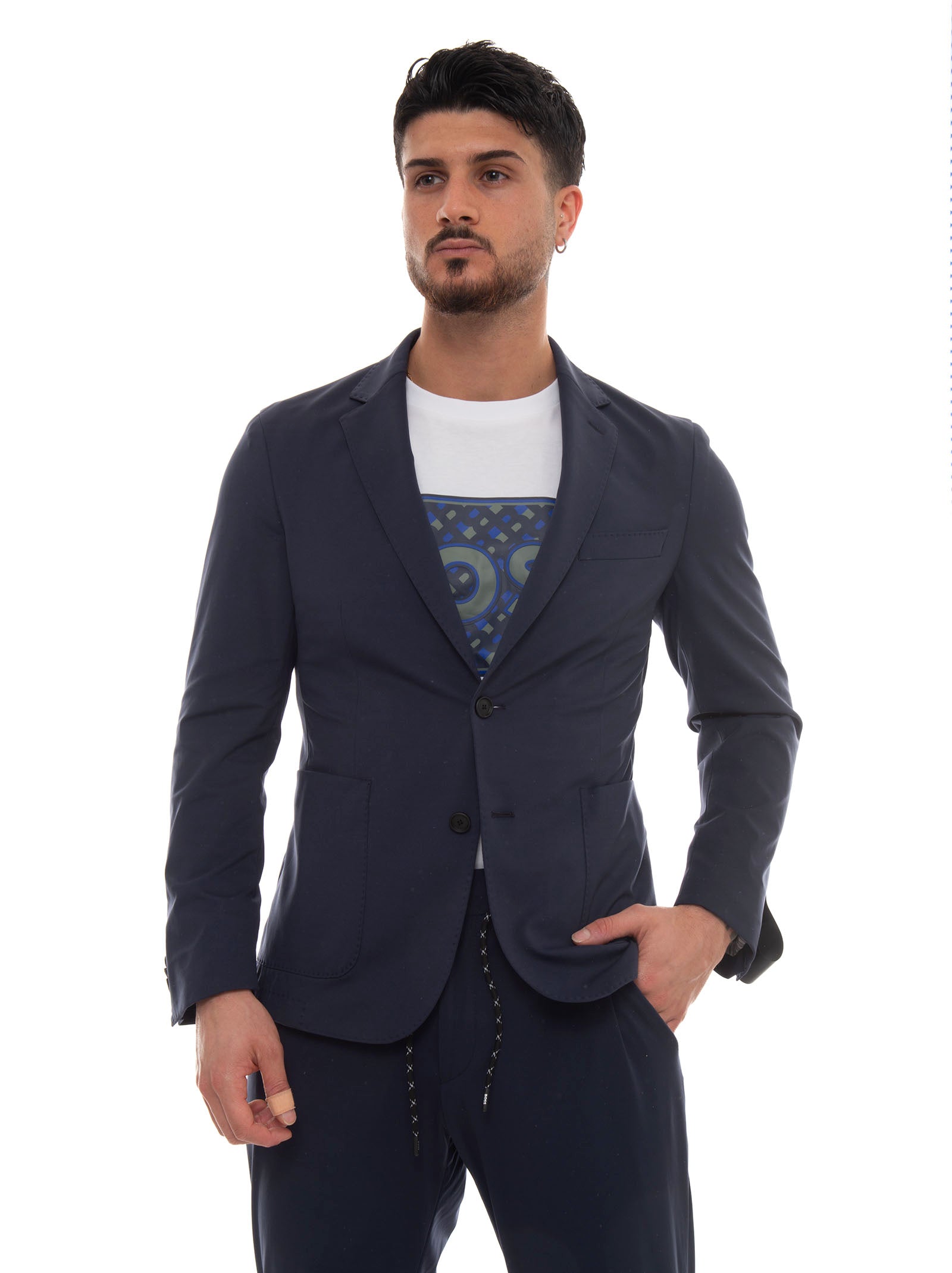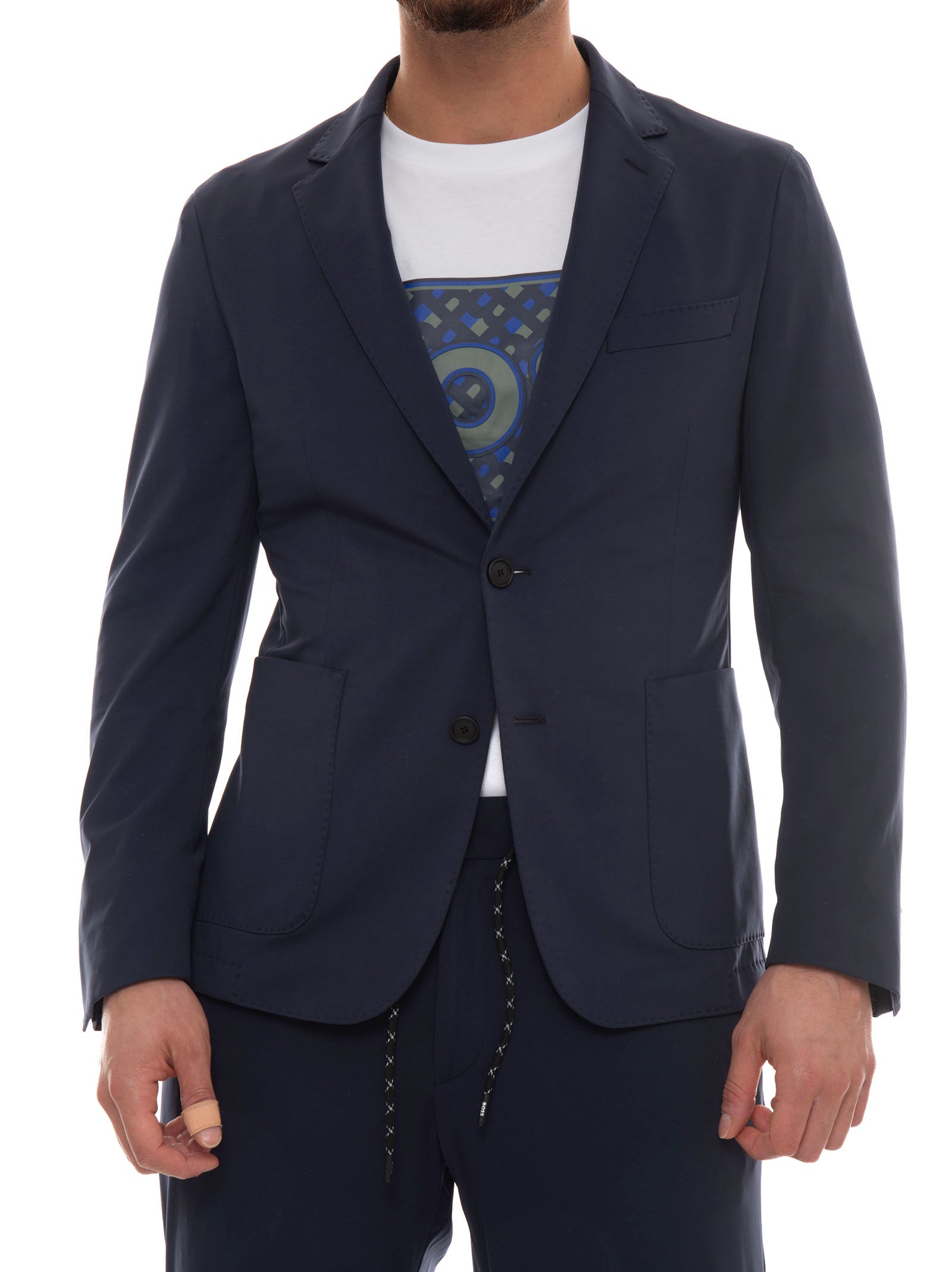 Giacca 2 bottoni BOSS P-HANRY, sfoderata, tasche a toppa, tessuto tecnico, lunghezza giacca 74cm (per tg.50), spacchi laterali, vestibilità slim, composizione: 81% poliammide, 19% elastan, linea: BOSS.