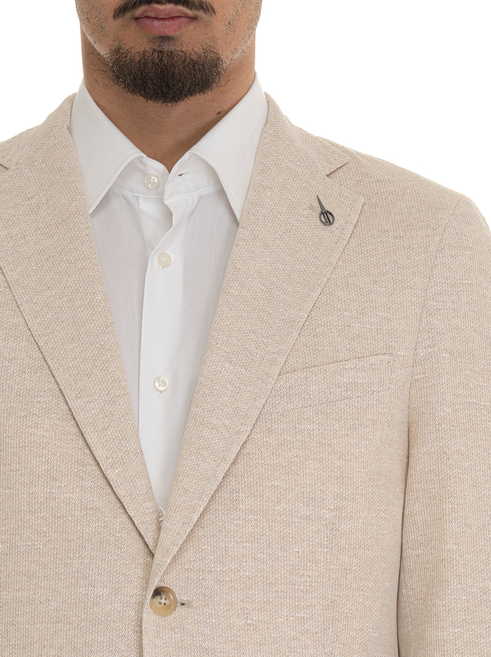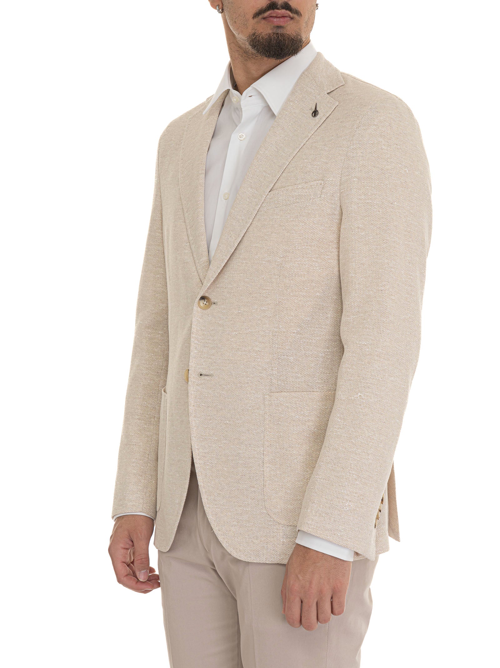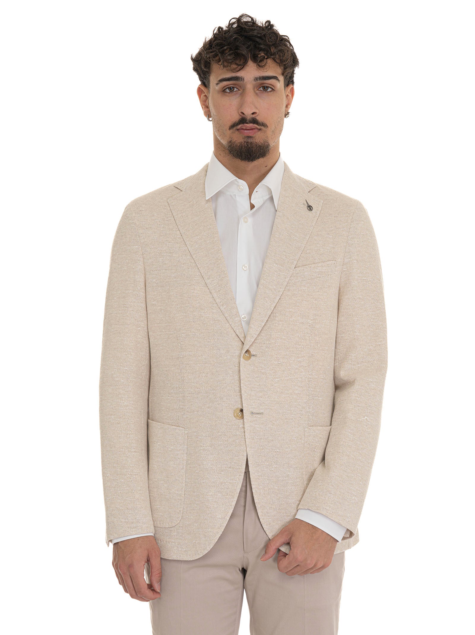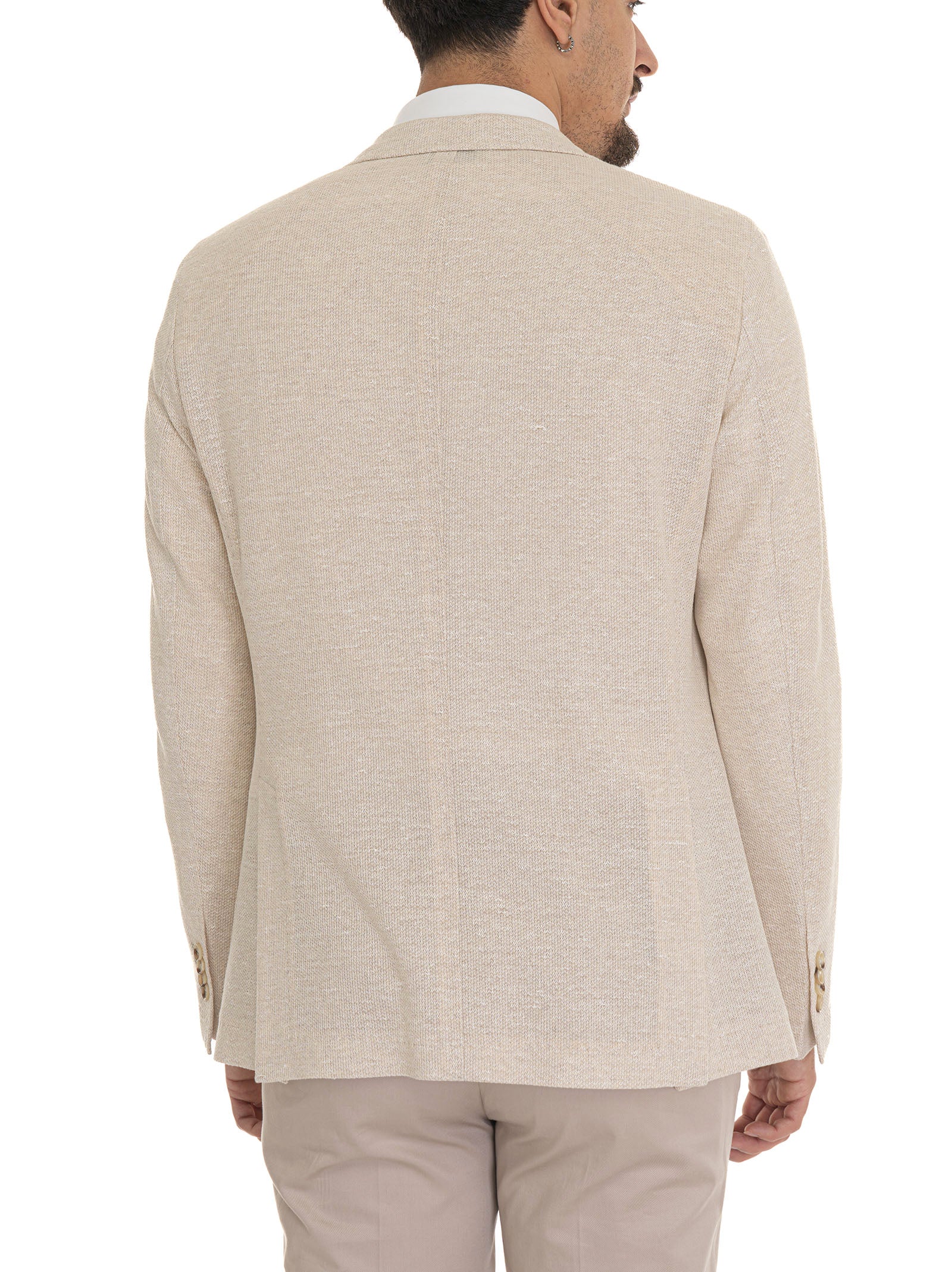 Giacca sfoderata decostruita, 2 bottoni, tasche a toppa, tessuto operato, spacchi laterali, lunghezza giacca 71cm (per tg.50), composizione: 38% lino, 31% cotone, 31% poliammide, linea: PAOLONI.