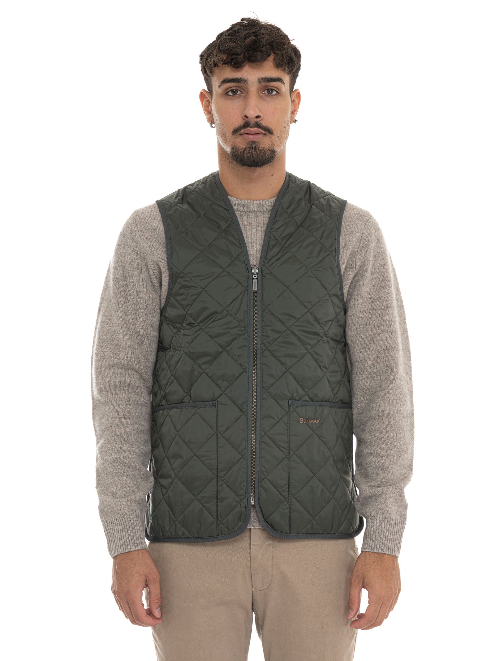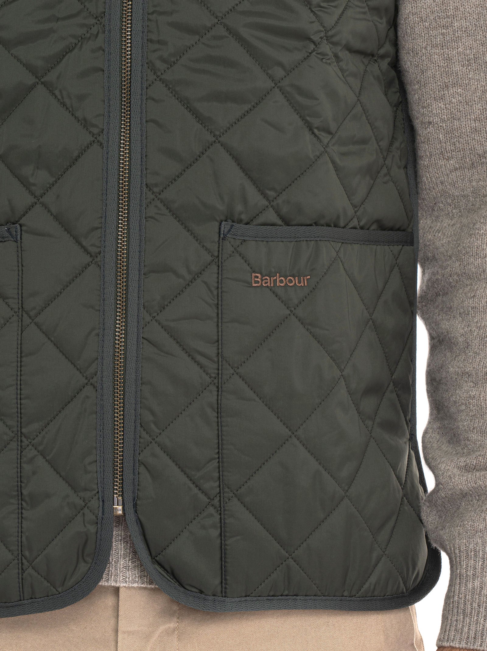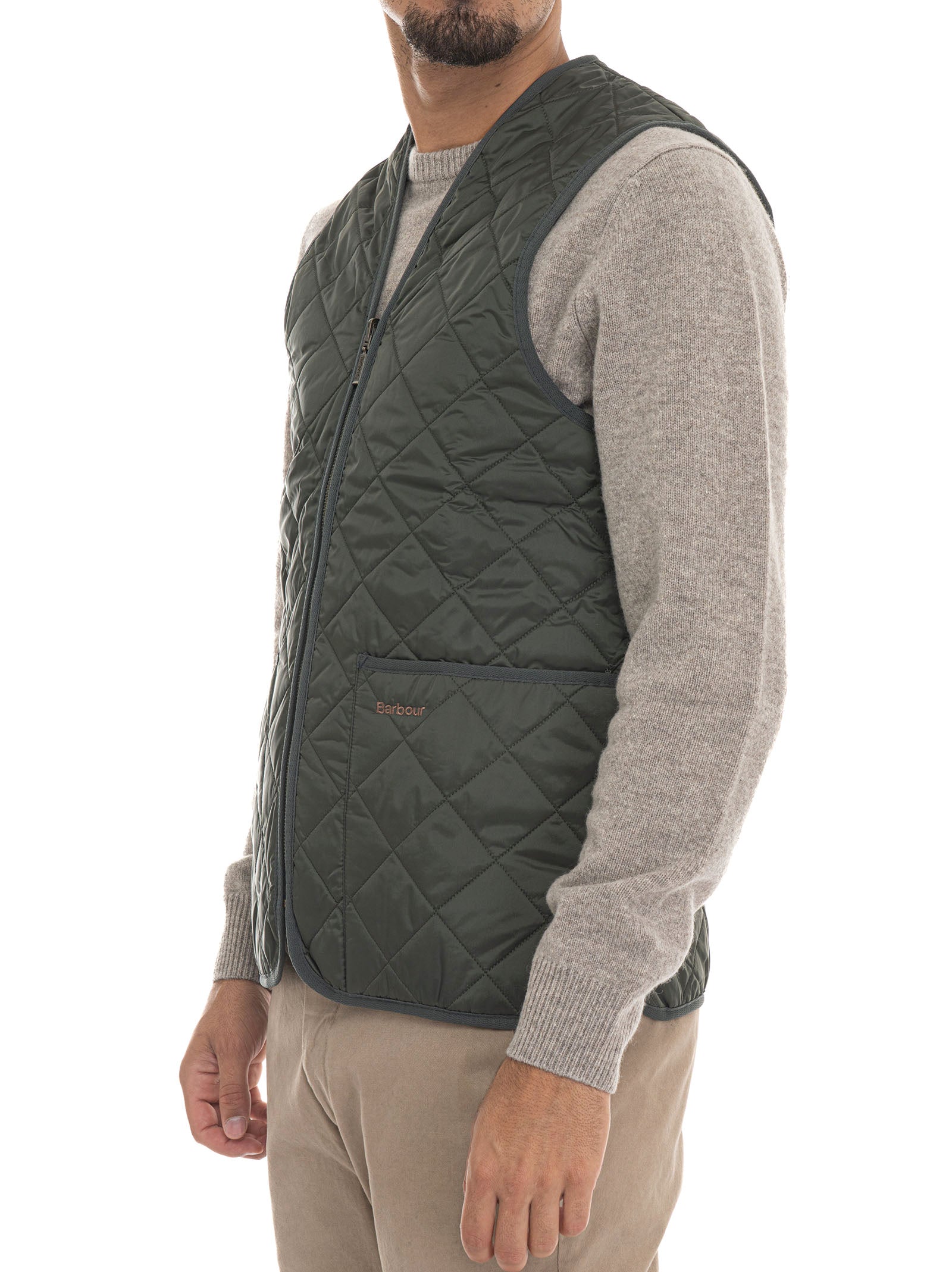 Gilet trapuntato, chiusura zip, tasche a toppa, logo cucito a contrasto, fodera interna a quadri, interno bedale beaufort, composizione: 100% poliammide, linea: BARBOUR.