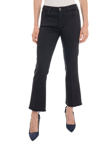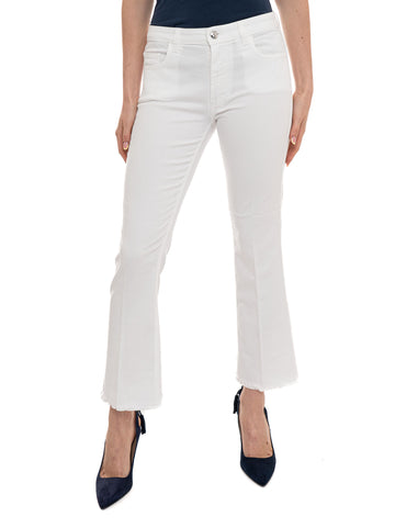 Jeans 5 tasche, gamba svasata sul fondo, frange sul fondo, impunture in contrasto, elasticizzato, composizione:...