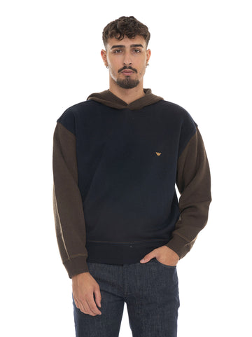 Maglia in lana, con cappuccio, logo cucito sul petto, bicolore, polsini e fondo in maglia...