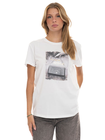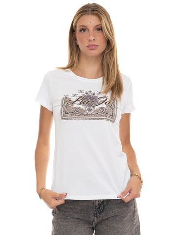 T-shirt, girocollo, manica corta, stampa frontale, applicazioni strass, composizione: 100% cotone, linea: LIU JO.