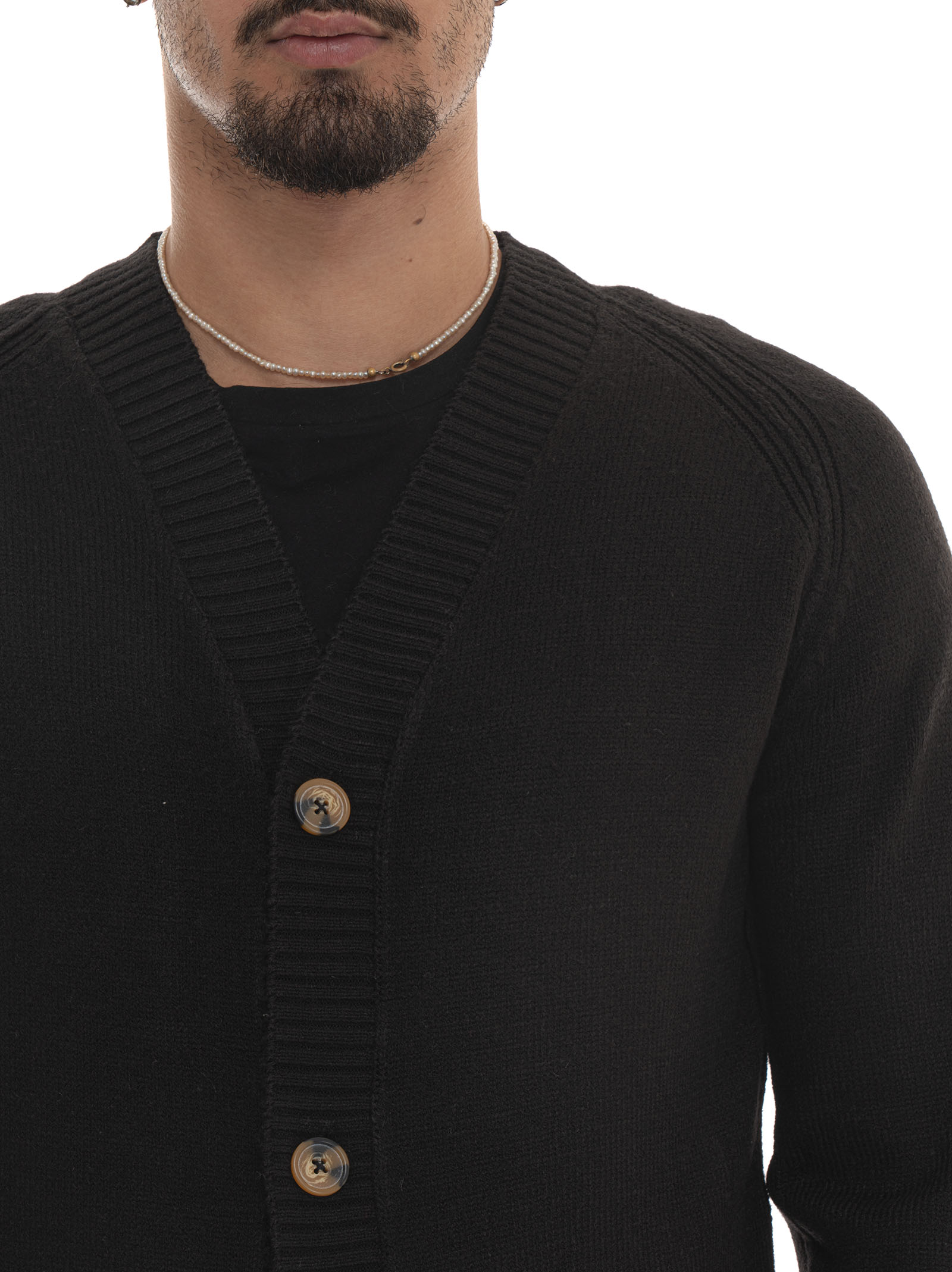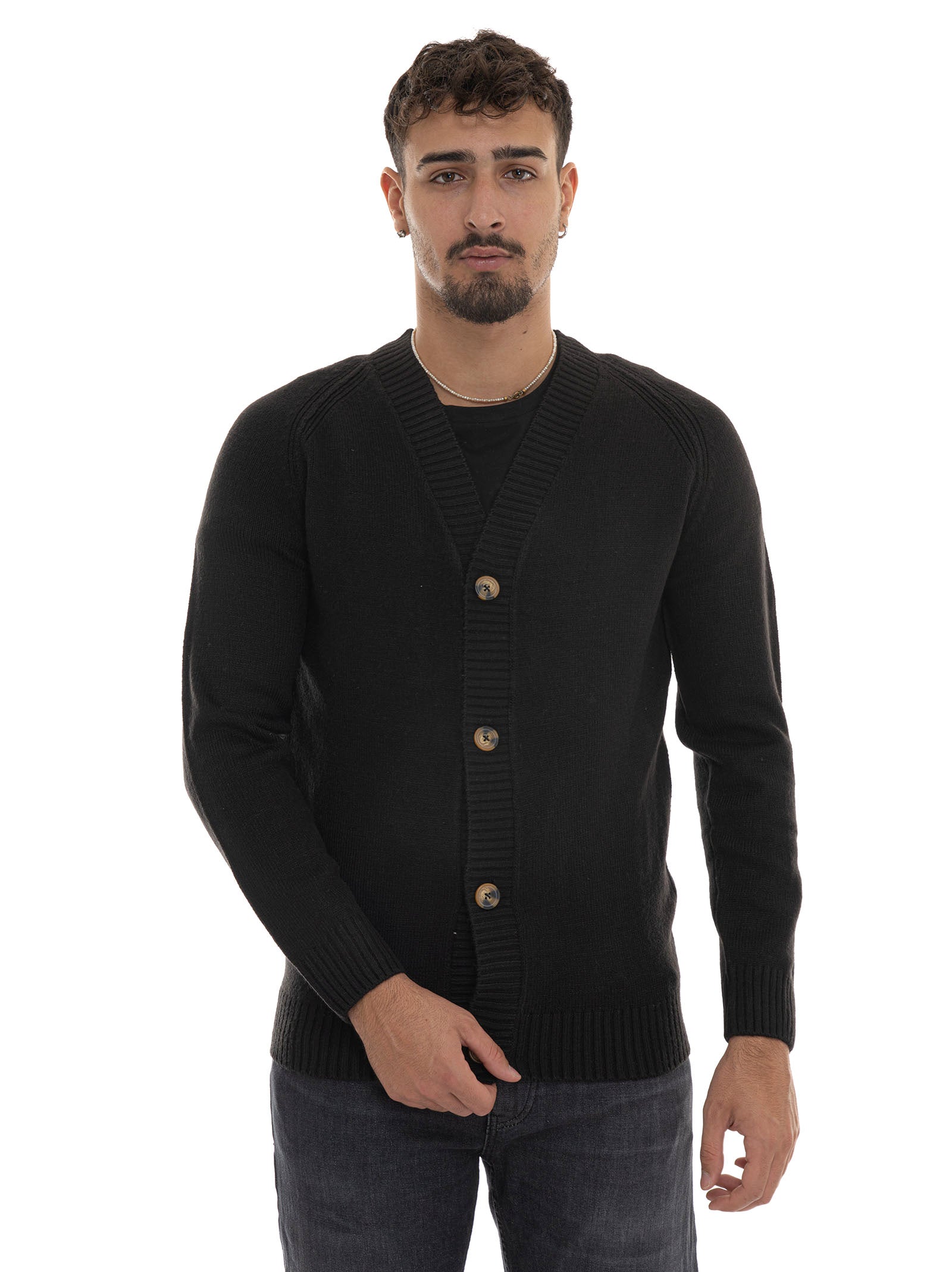 Cardigan bottoni, scollo a v, collo, polsi e fondo a costine, bottoni a contrasto, composizione: 70% acrilico, 30% nylon, linea: QUALITY FIRST.