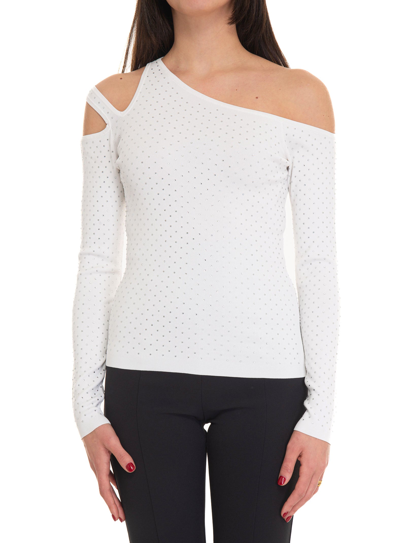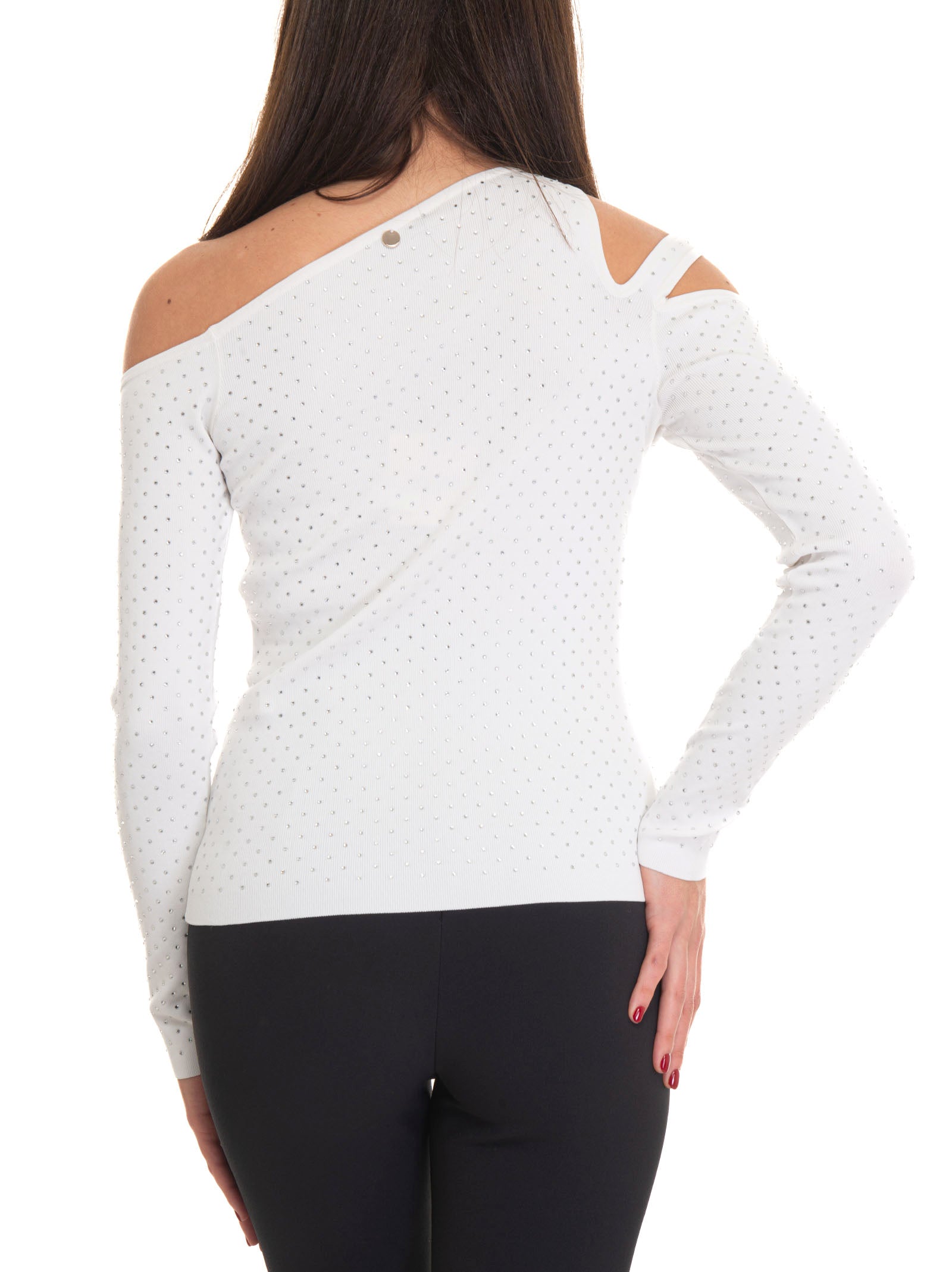 Maglia, collo a barchetta, maniche lunghe, tessuto stretch, applicazioni strass, linguetta con logo, composizione: 52% viscosa, 28% poliammide, 20% elastan, linea: LIU JO.