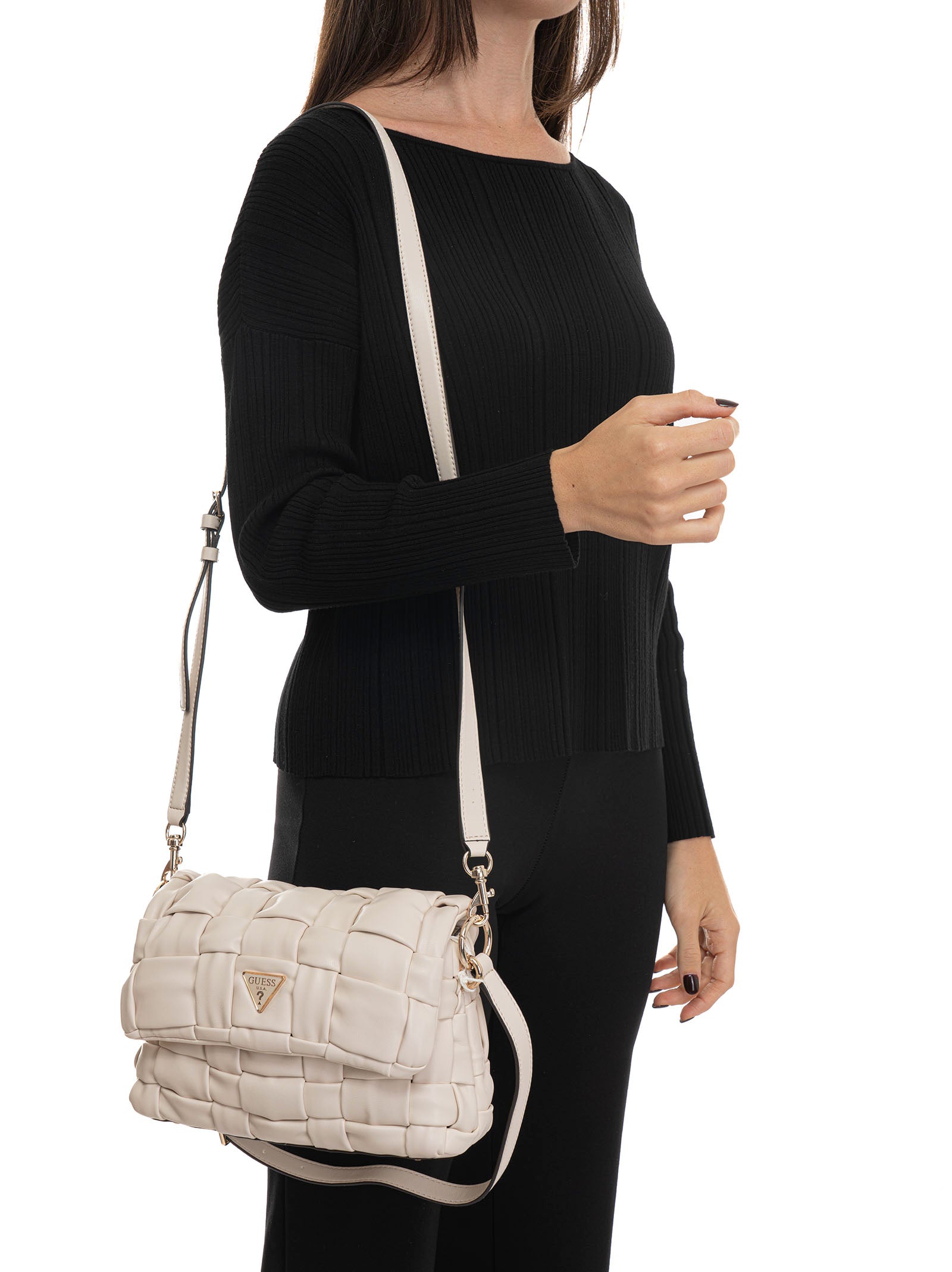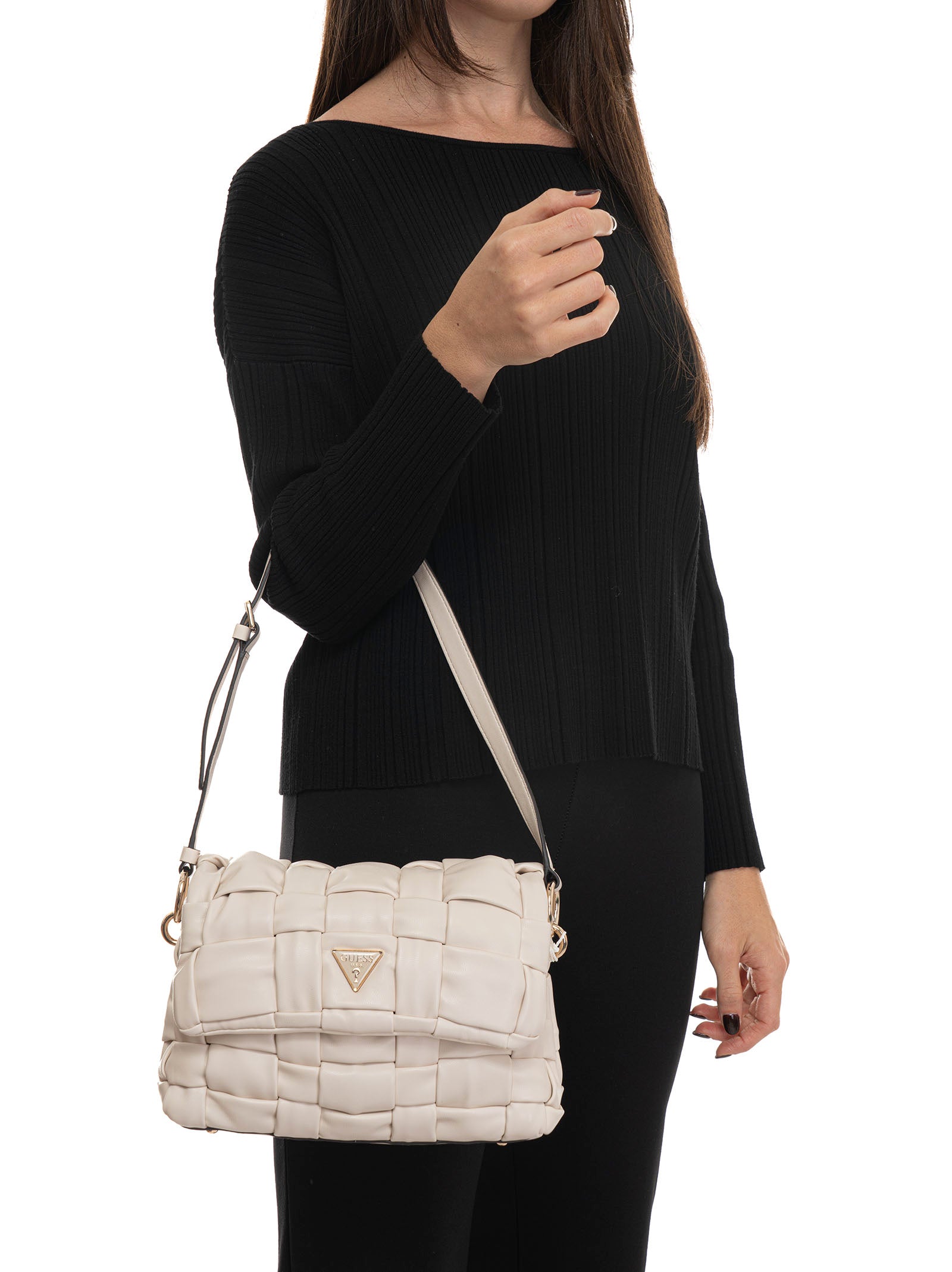 Borsa media Guess Marion flap, tracolla removibile e regolabile, lavorazione effetto intrecciato, chiusura con patta e bottone automatico, logo anteriore, tasche interne multifunzione, composizione: 100% poliuretanico, linea: GUESS.