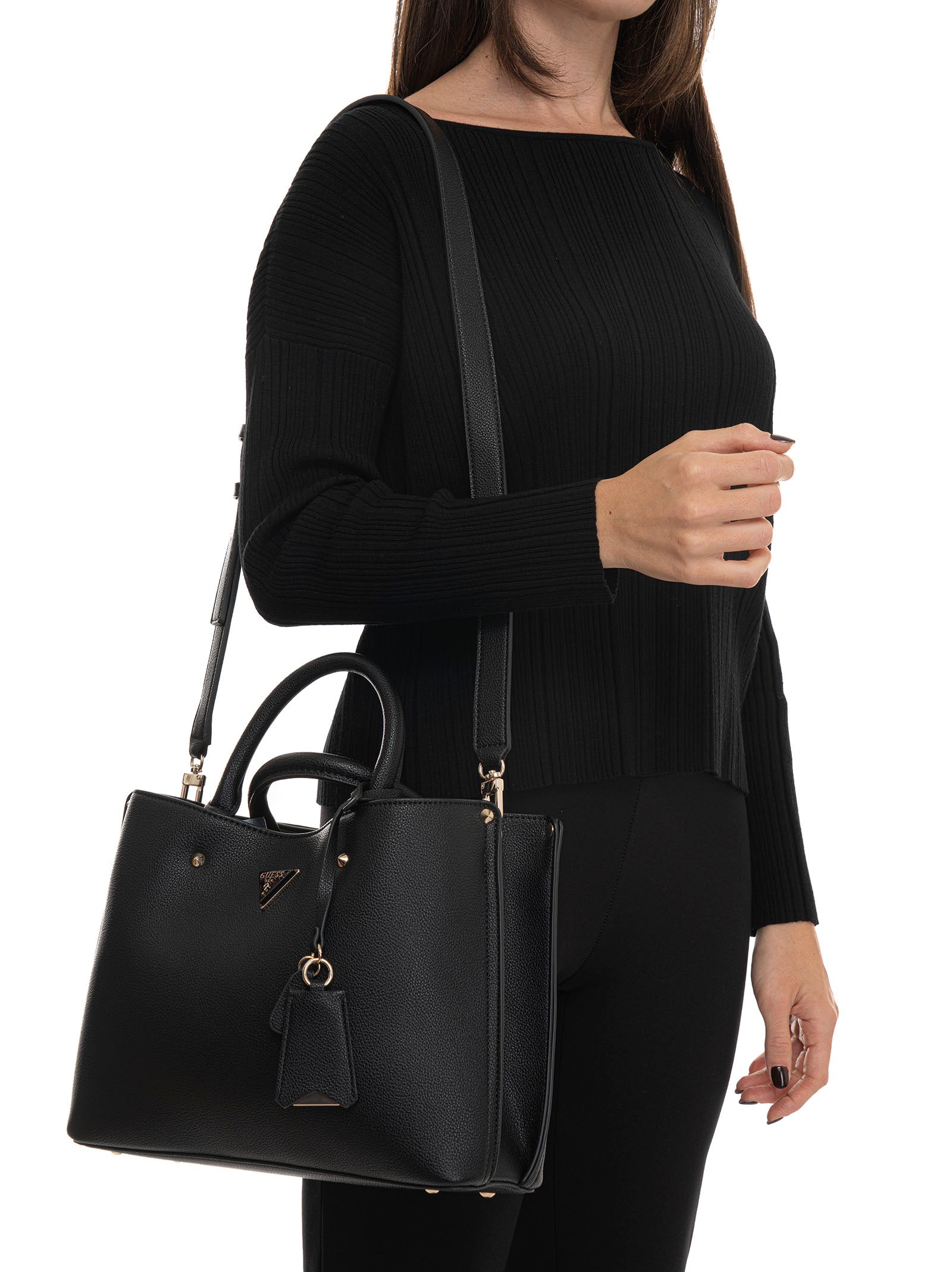 Borsa media Guess Meridian , due manici, tracolla removibile e regolabile, tre tasche interne: una con chiusura lampo e due aperte, logo anteriore, piedini metallici alla base, composizione: 100% poliuretanico, linea: GUESS.