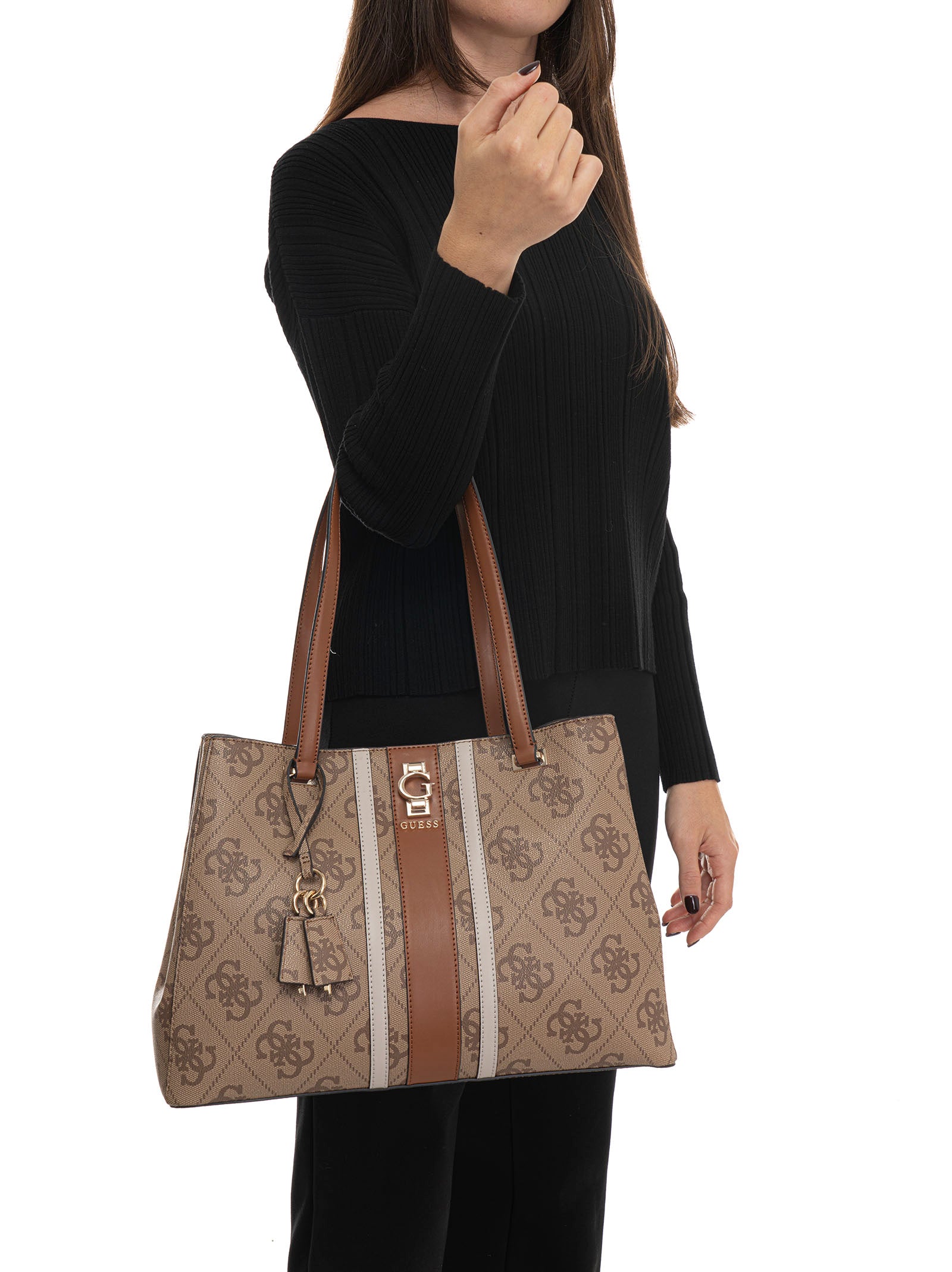 Borsa shopping Guess Erenia , due manici, chiusura calamitata, tasche interne multifunzione, logo all over, charm removibile, piedini metallici alla base, composizione: 100% poliuretanico, linea: GUESS.