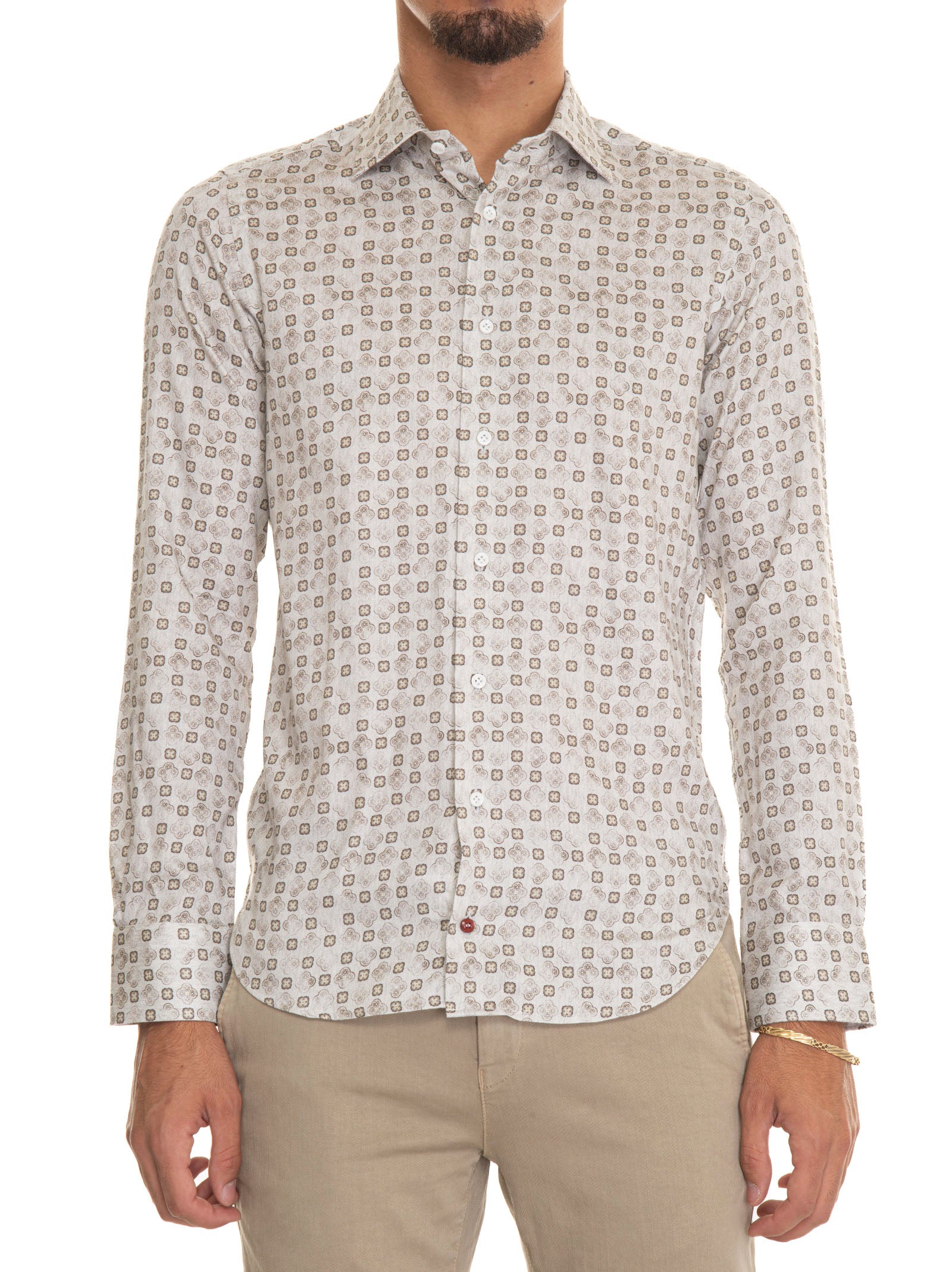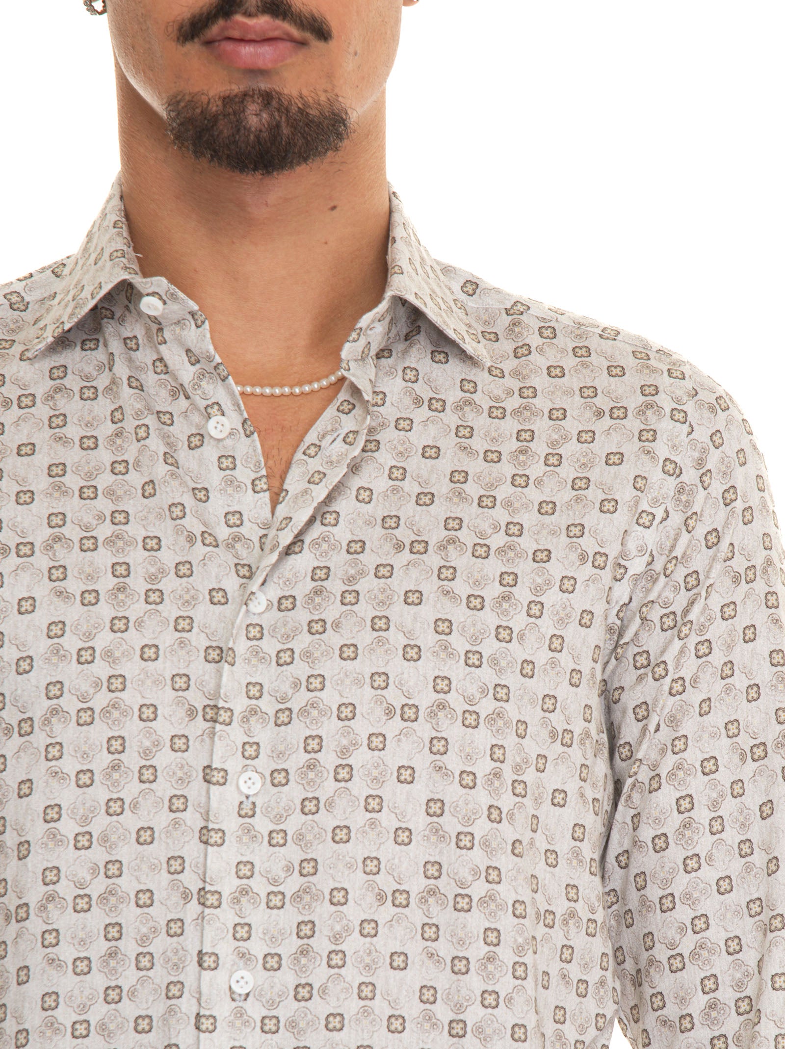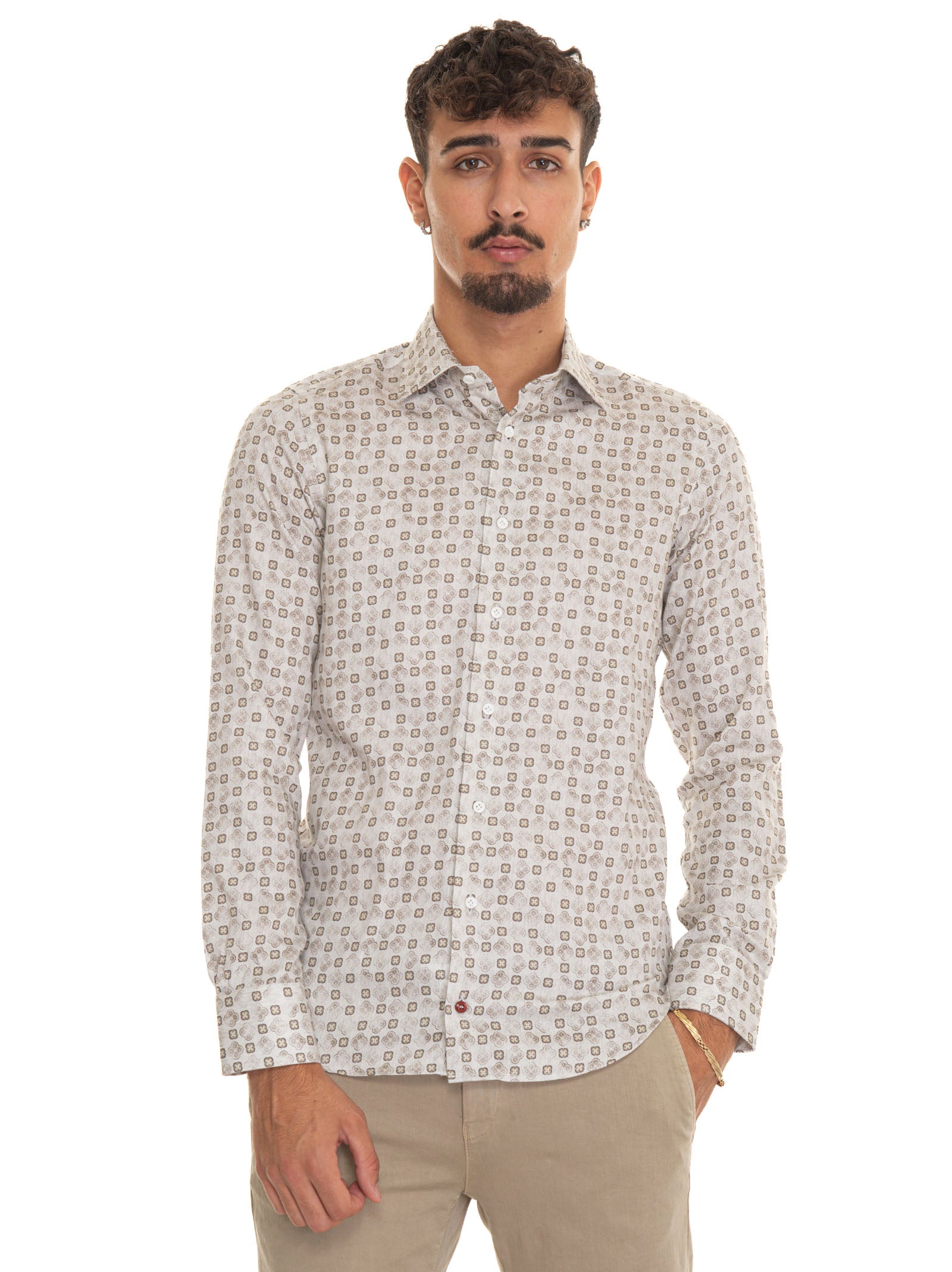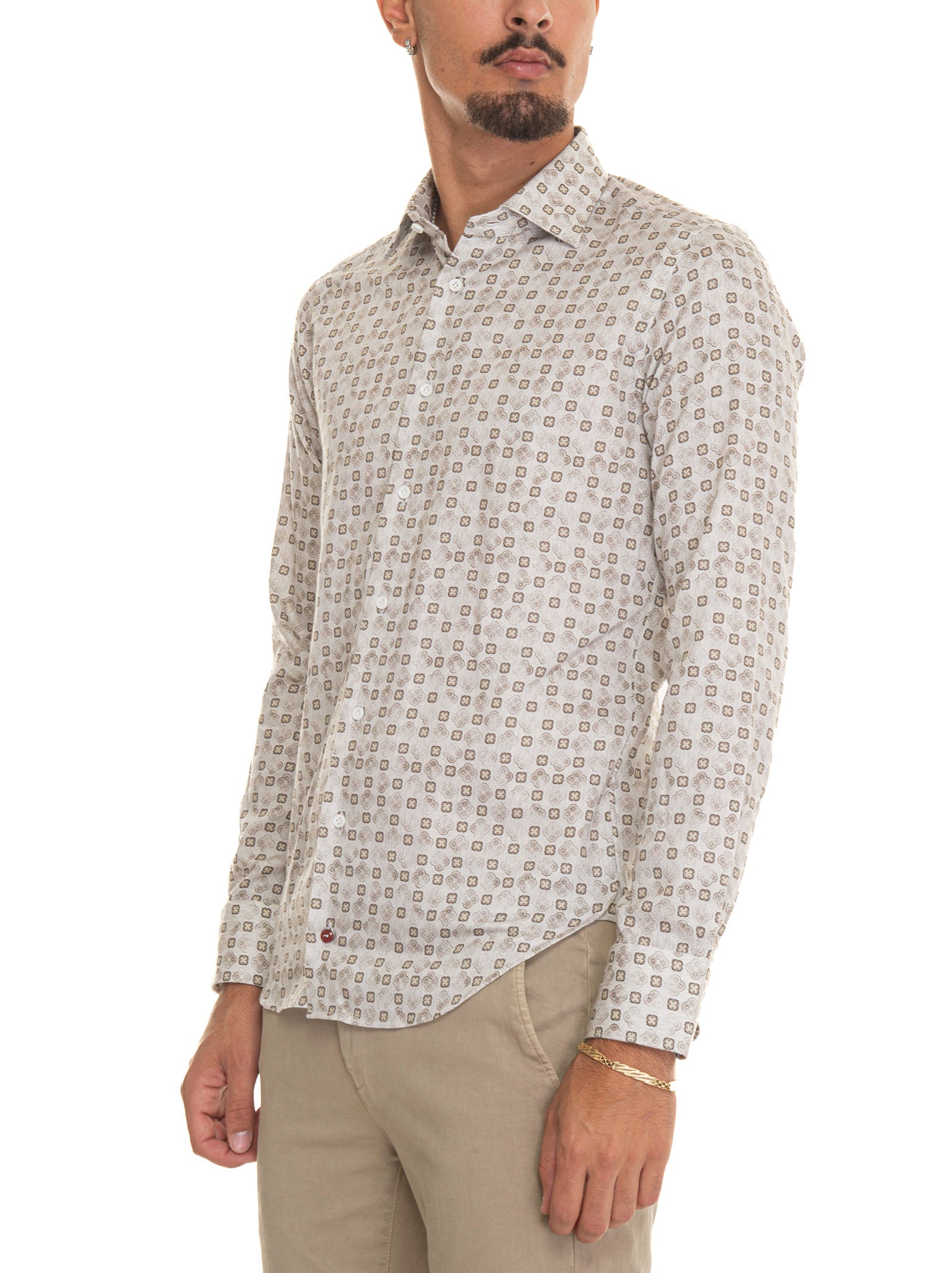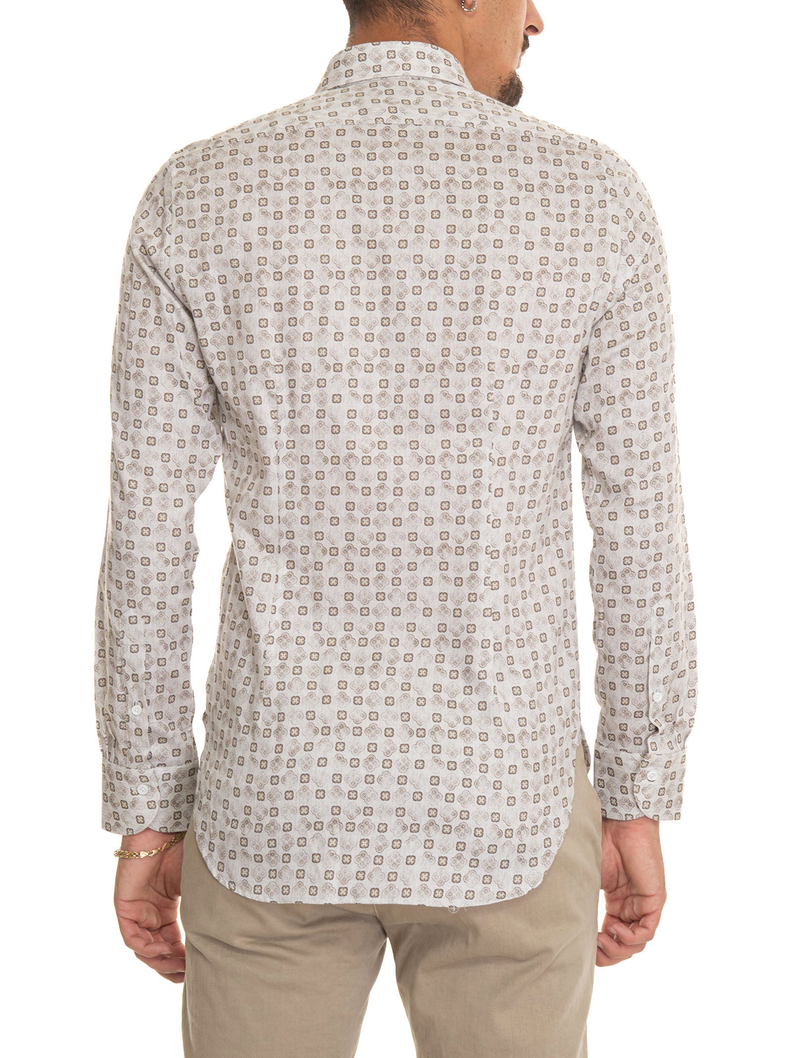 Camicia casual, collo classico italiano, fantasia, pochette in abbinato, schiena con due pinces, vestibilità dressed, composizione: 100% cotone, linea: CARREL.
