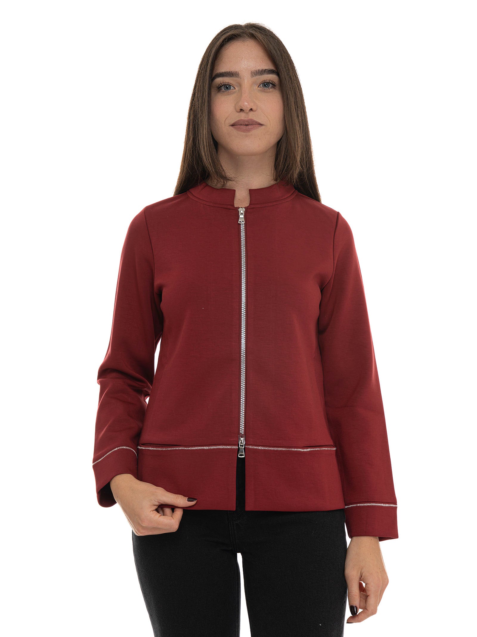 Felpa, chiusura zip con doppio cursore, applicazioni strass, dettagli a contrasto di colore, tasche a filo, spacchetti sul fondo, composizione: 48% viscosa, 46% poliestere, 6% elastan, linea: QUALITY FIRST.
