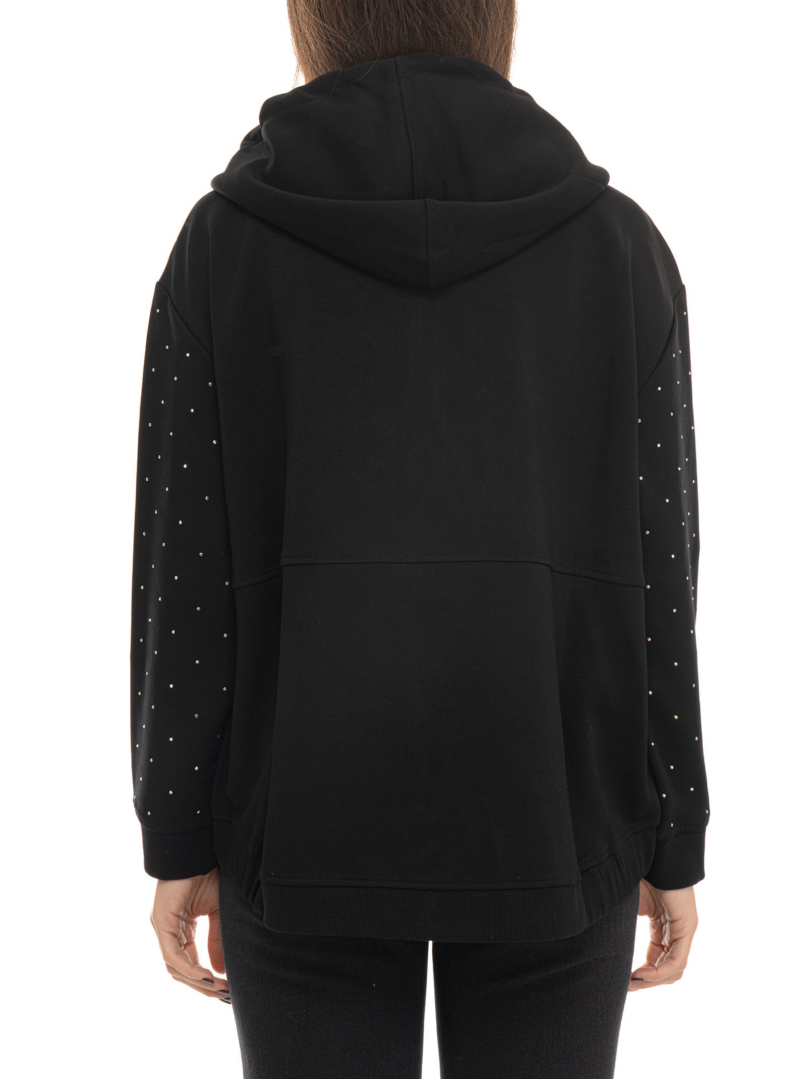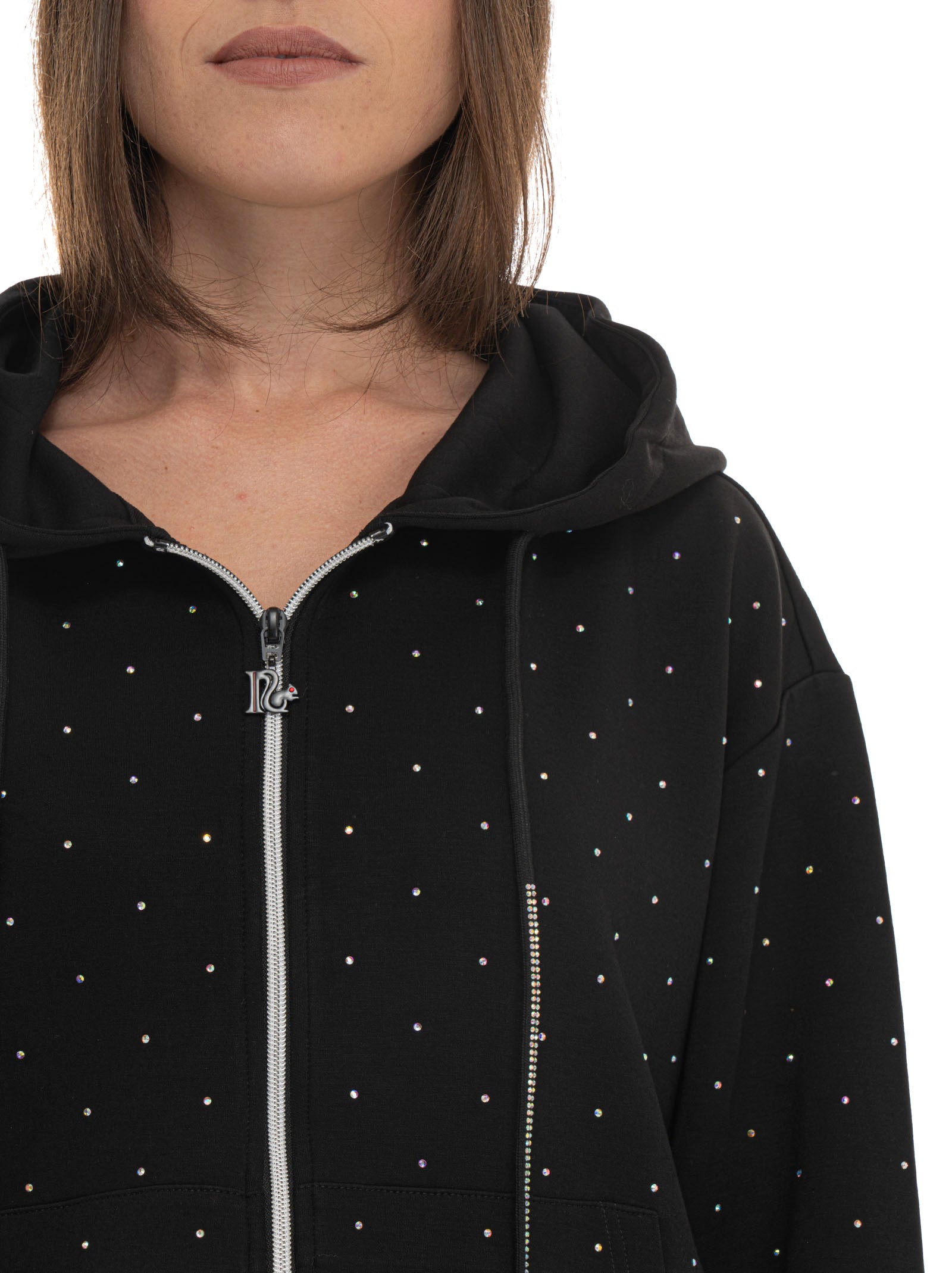 Felpa con cappuccio, chiusura zip con doppio cursore, applicazioni strass, polsini e molla elasticizzati, tasche a marsupio, composizione: 48% viscosa, 46% poliestere, 6% elastan, linea: QUALITY FIRST.