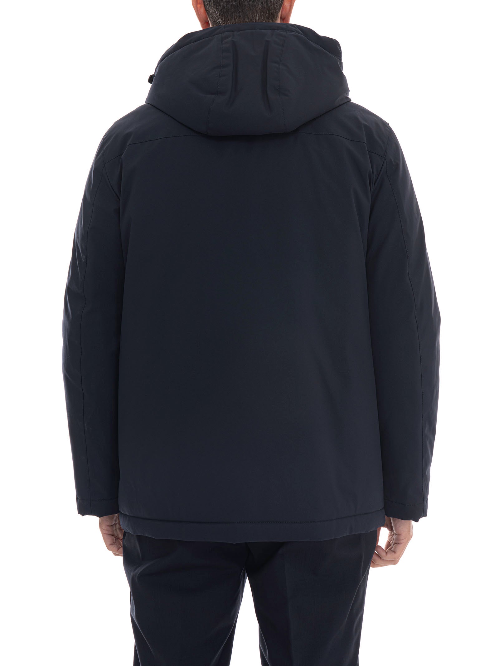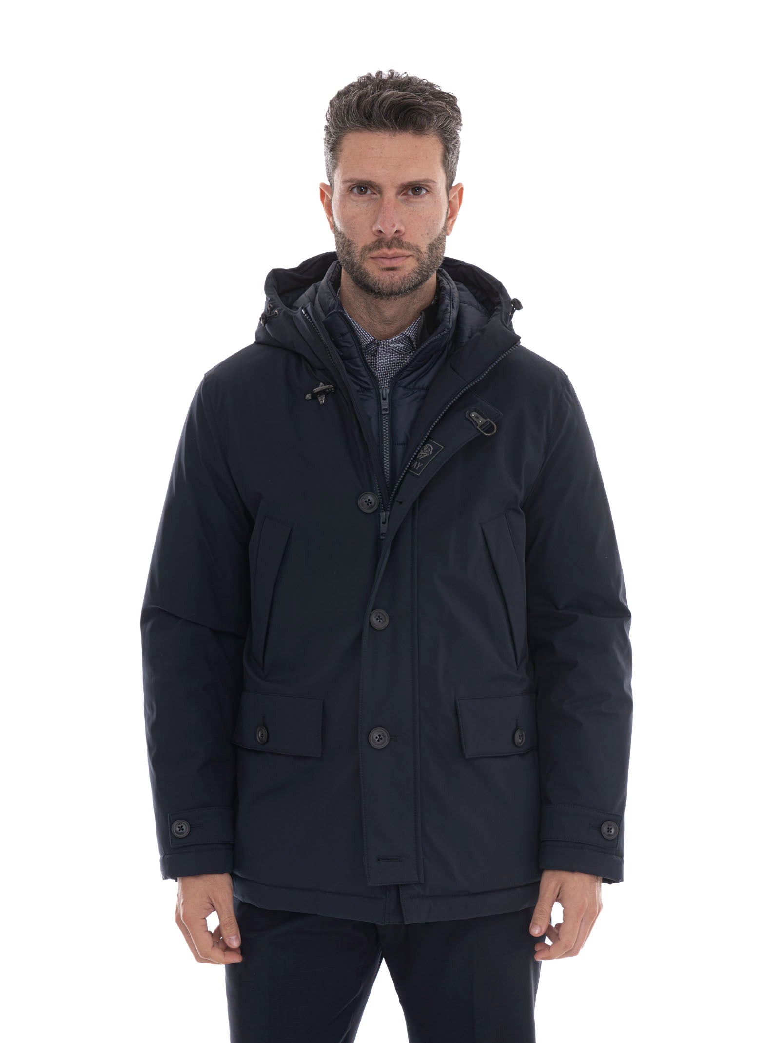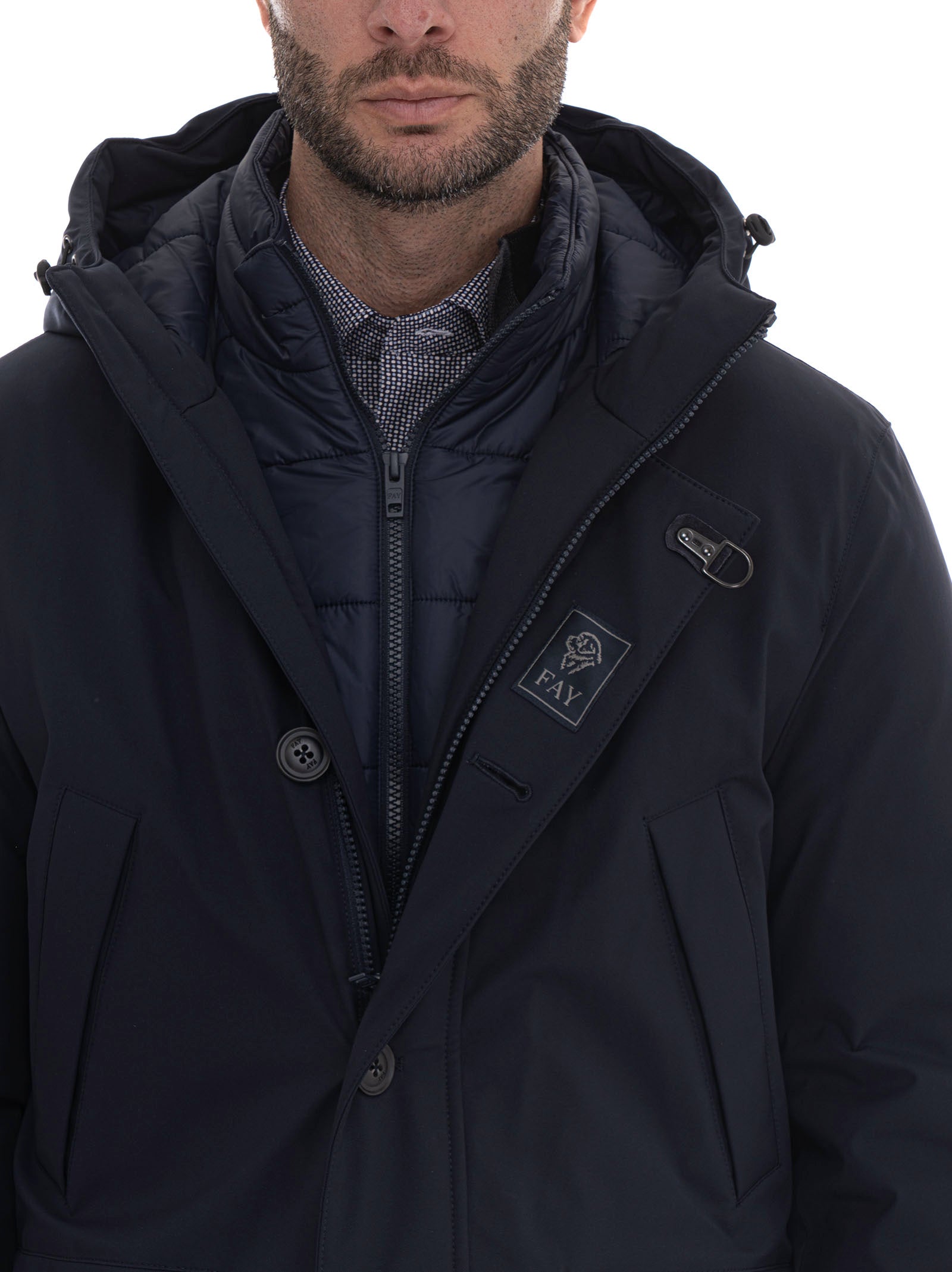 Giaccone, modello parka, cappuccio fisso, iconico gancio fay, chiusura con bottone e zip a scomparsa, pettorina interna, tasca interna, composizione: 100% poliestere, linea: FAY.