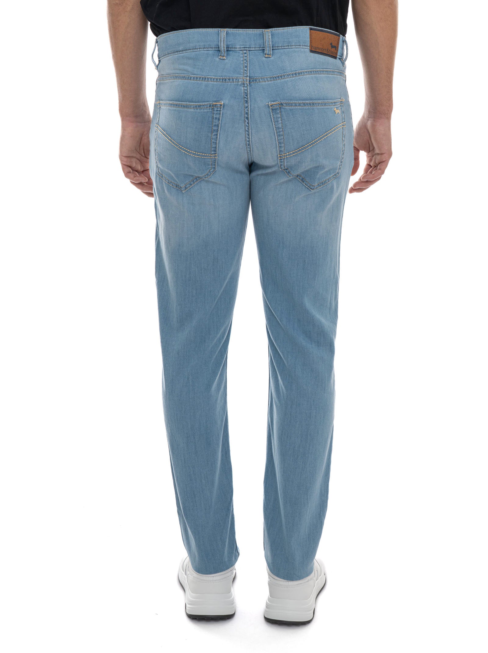 Jeans 5 tasche, stone washed, chiusura con bottone e zip a scomparsa, logo tasca destra, fondo 16 cm, tessuto ultra-leggero, impunture in contrasto, composizione: 81% cotone, 17% poliestere, 2% elastomultiestere, linea: HARMONT & BLAINE.