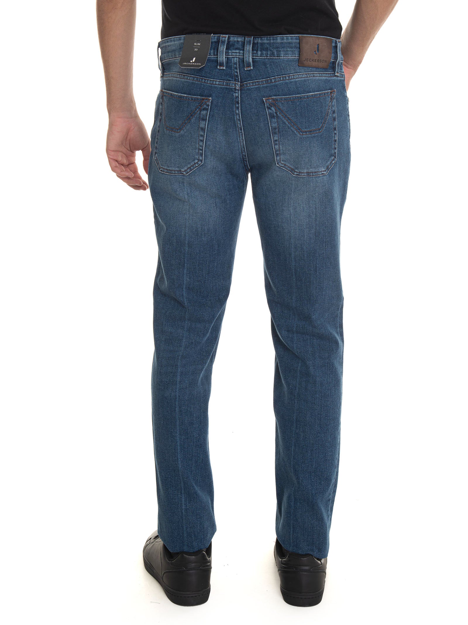 Jeans 5 tasche, denim medio, salpa in pelle, fondo 17 cm, chiusura con zip, composizione: 93% cotone, 5% elastomultiestere, 2% elastan, linea: JECKERSON.
