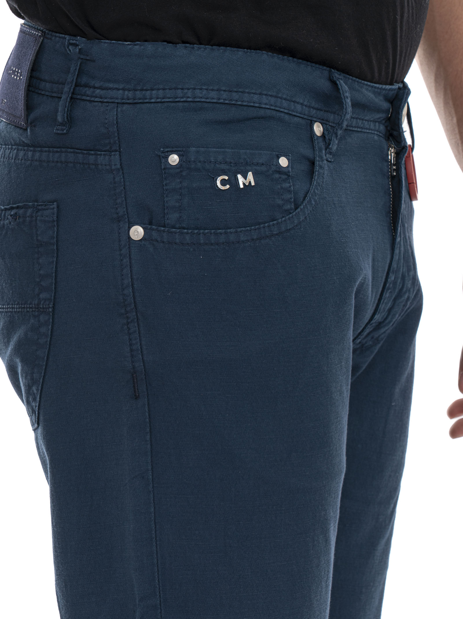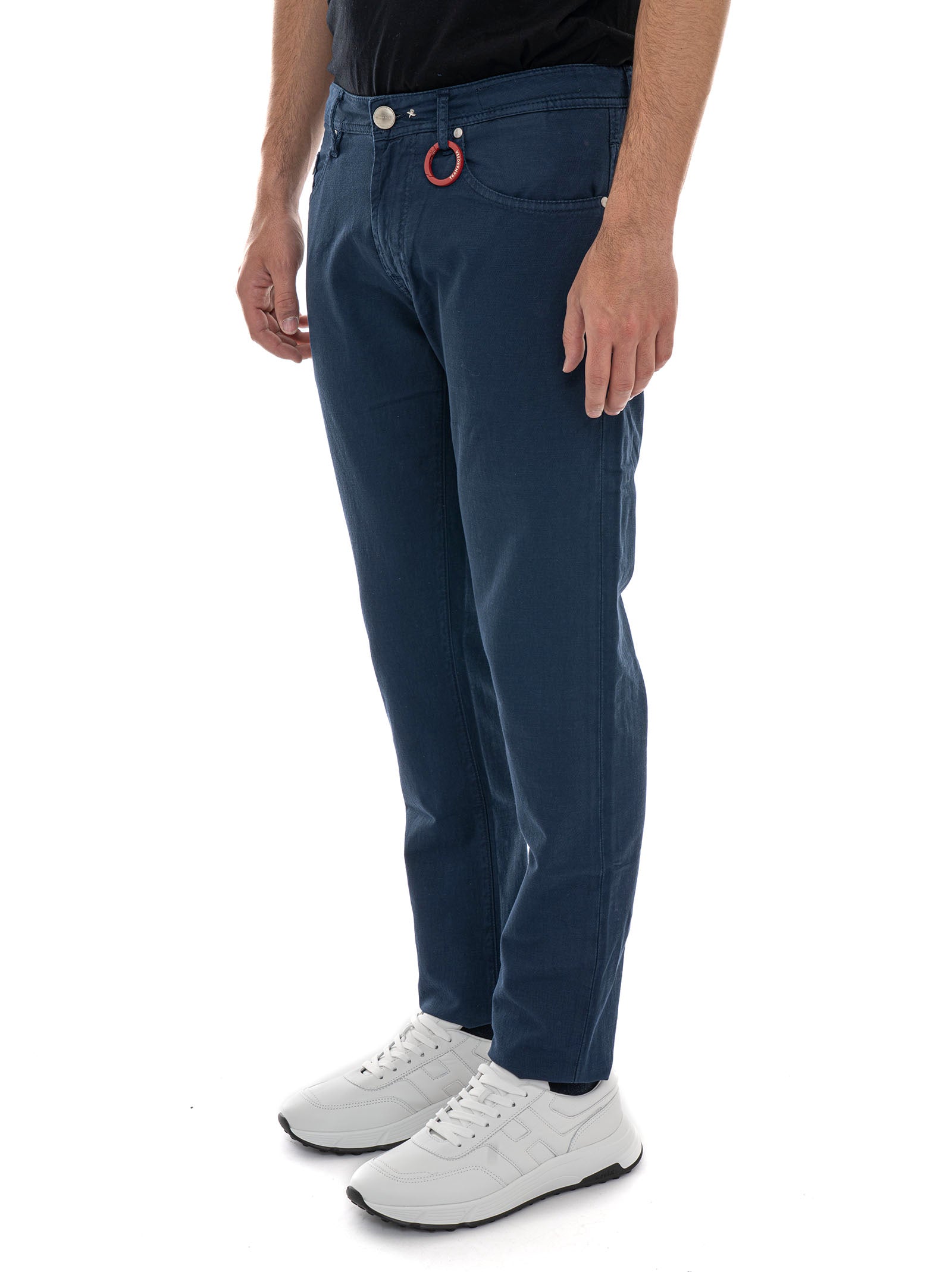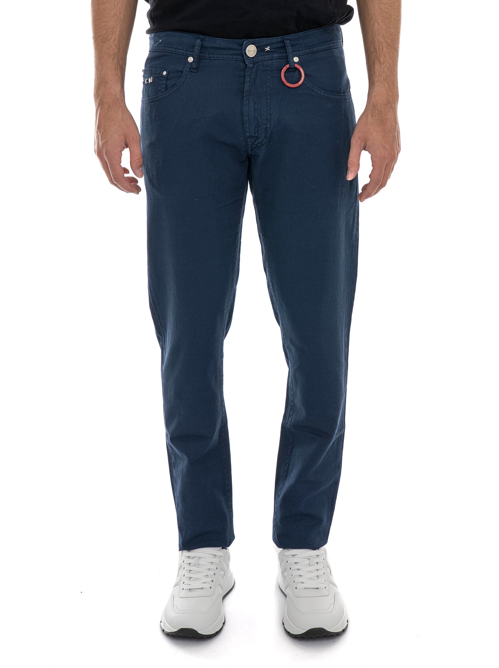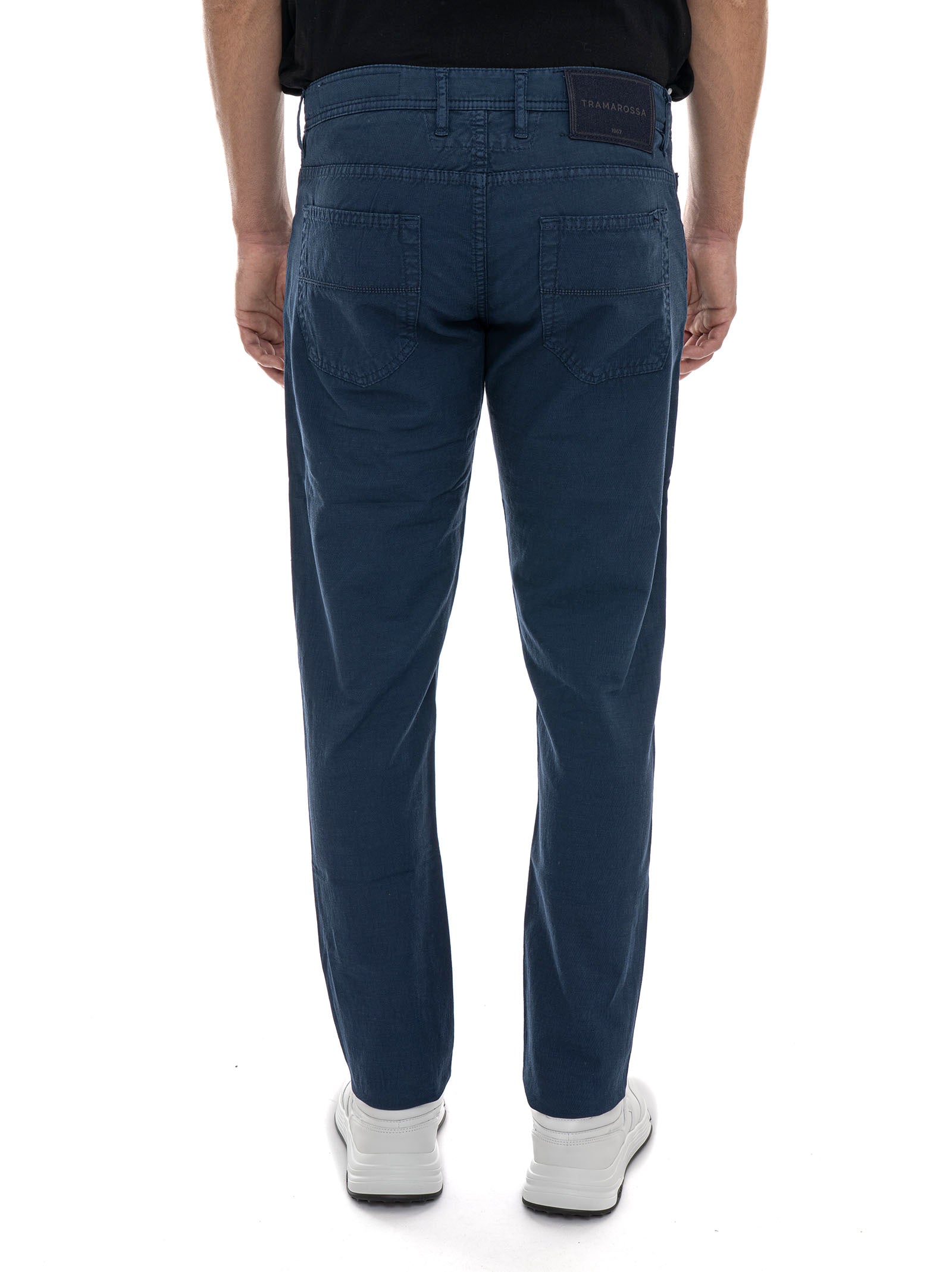 Pantalone 5 tasche Tramarossa LEONARDO-L012, chiusura con bottone e zip a scomparsa, personalizzabile con lettere, salpa logata, fondo 16 cm, effetto fiammato, composizione: 65% lino, 33% cotone, 2% elastan, linea: TRAMAROSSA.