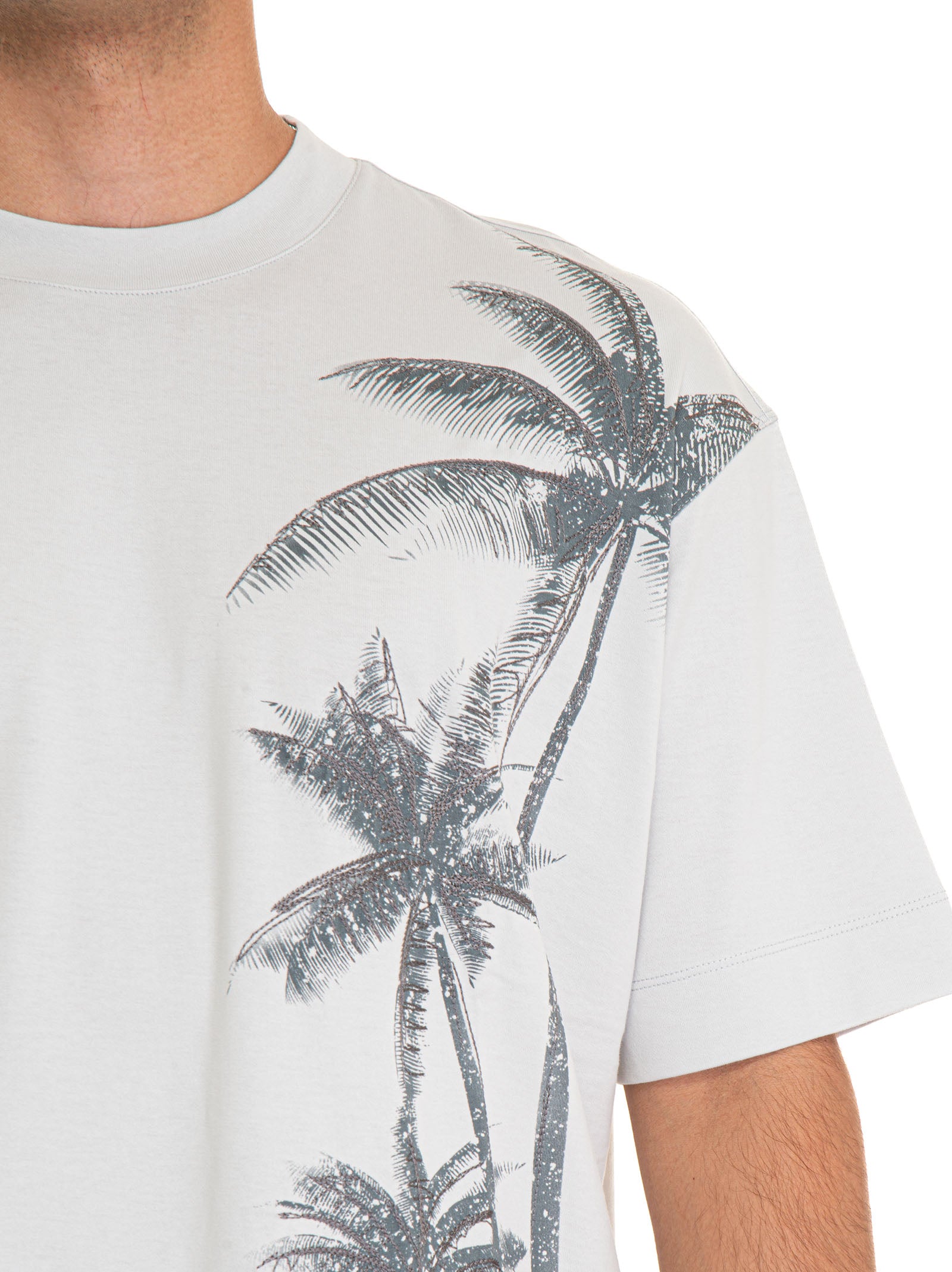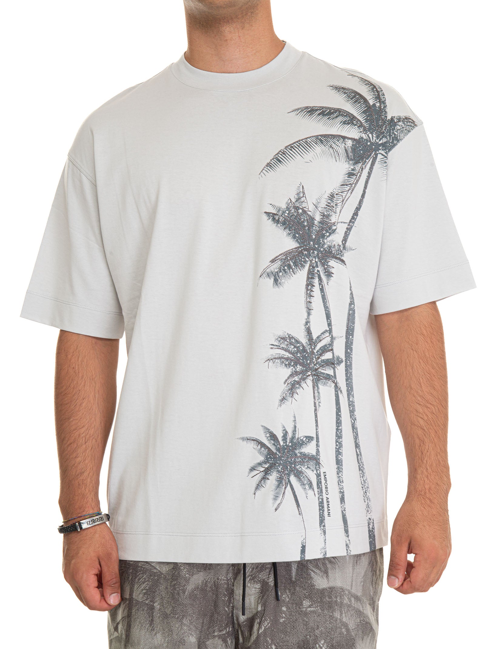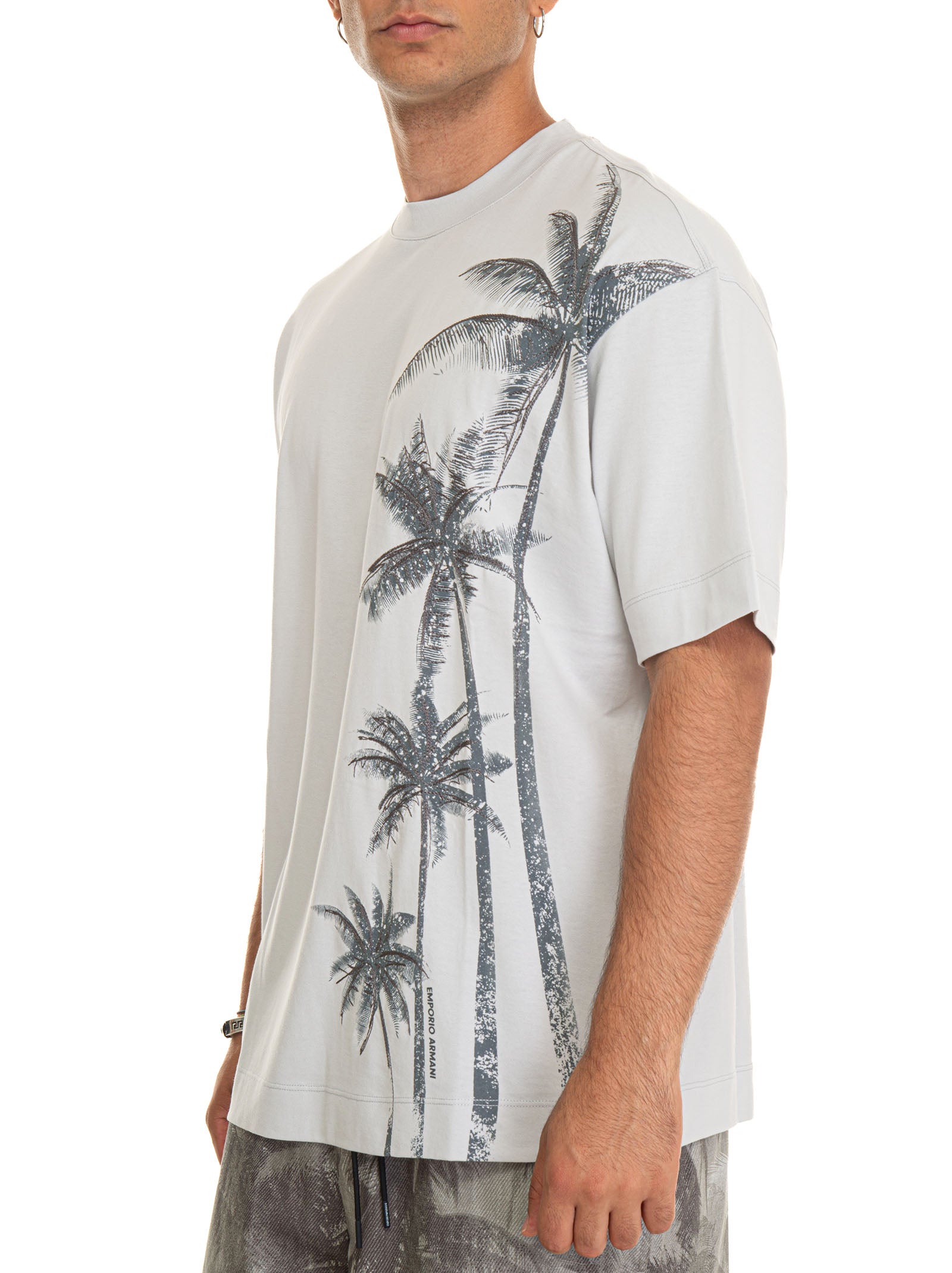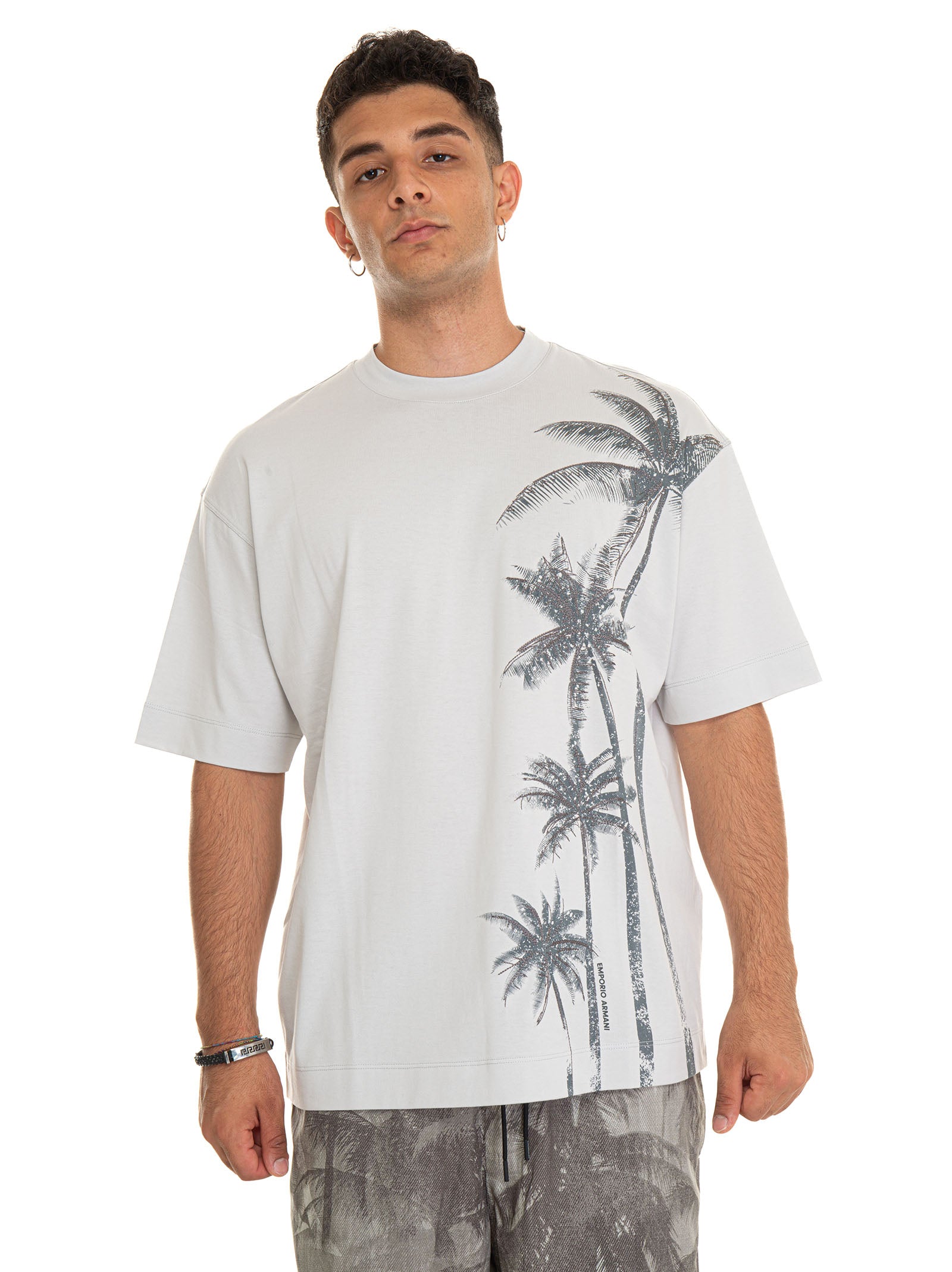 T-shirt girocollo, modello over, fantasia palme, composizione: 100% cotone, linea: EMPORIO ARMANI.